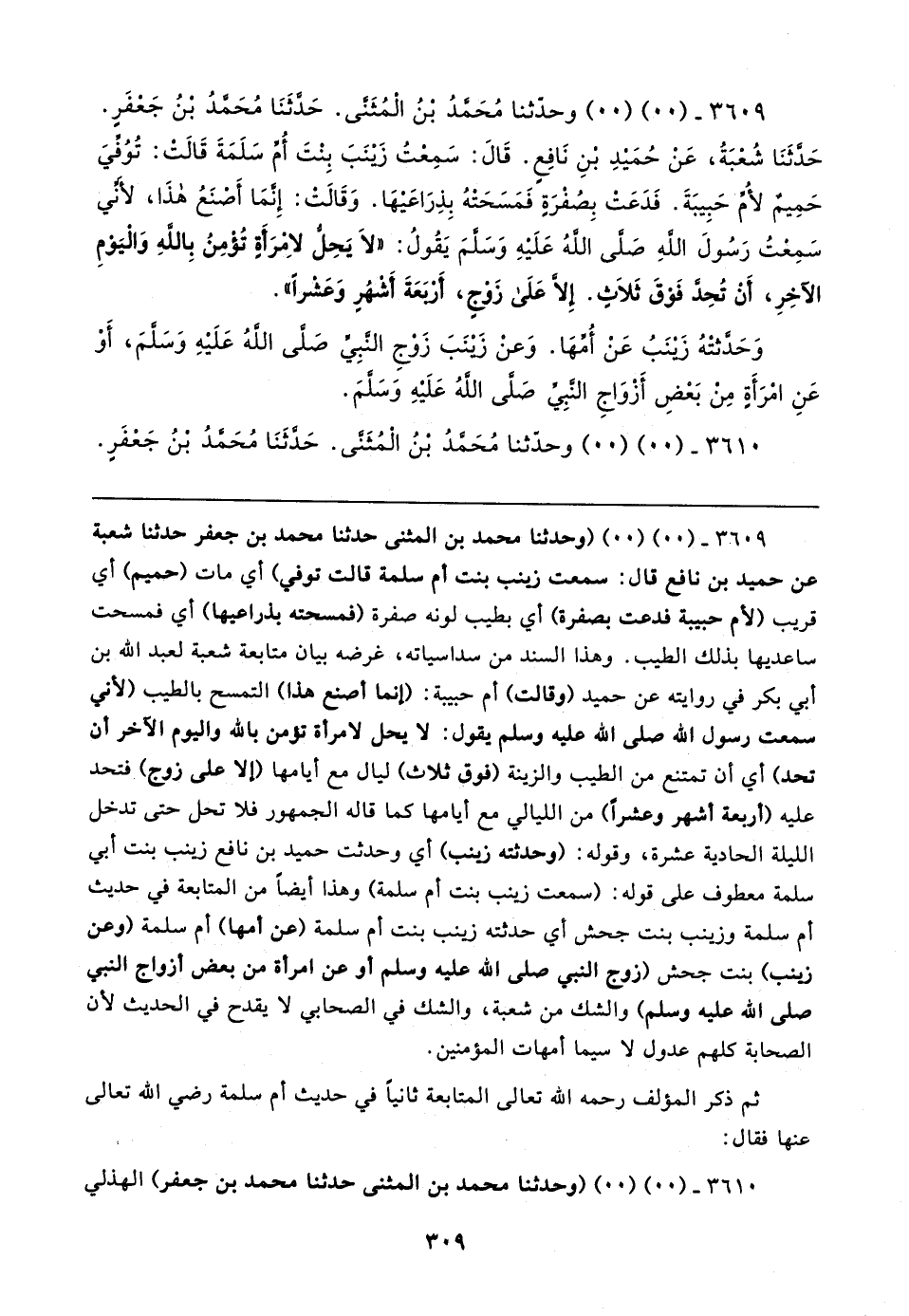 ٣٦٠٩ - (٠٠) (٠٠) وحدّثنا مُحَمَّدُ بْنُ المُثَنَّى. حَدَّثَنَا مُحَمَّدُ بْنُ جَعْفَرٍ. حَدَّثنَا شُعْبَةُ، عَنْ حُمَيدِ بْنِ نَافِعٍ. قَال: سَمِعْتُ زينَبَ بِنْتَ أُمِّ سَلَمَةَ قَالتْ: تُوُفِّيَ حَمِيمٌ لأُمِّ حَبِيبَةَ. فَدَعَتْ بِصُفْرَةِ فَمَسَحَتهُ بِذِرَاعَيهَا. وَقَالتْ: إِنَّمَا أَصْنَعُ هذَا، لأَنِّي سَمِعْتُ رَسُولَ الله صَلَّى الله عَلَيهِ وَسَلَّمَ يَقُولُ: "لَا يَحِلُّ لامْرَأَةٍ تُؤمِنُ بِاللهِ وَالْيَوْمِ الآخِرِ، أَنْ تُحِدَّ فَوْقَ ثَلاثٍ. إلَّا عَلَى زَوْجٍ، أَرْبَعَةَ أَشْهُرٍ وَعَشْرًا".