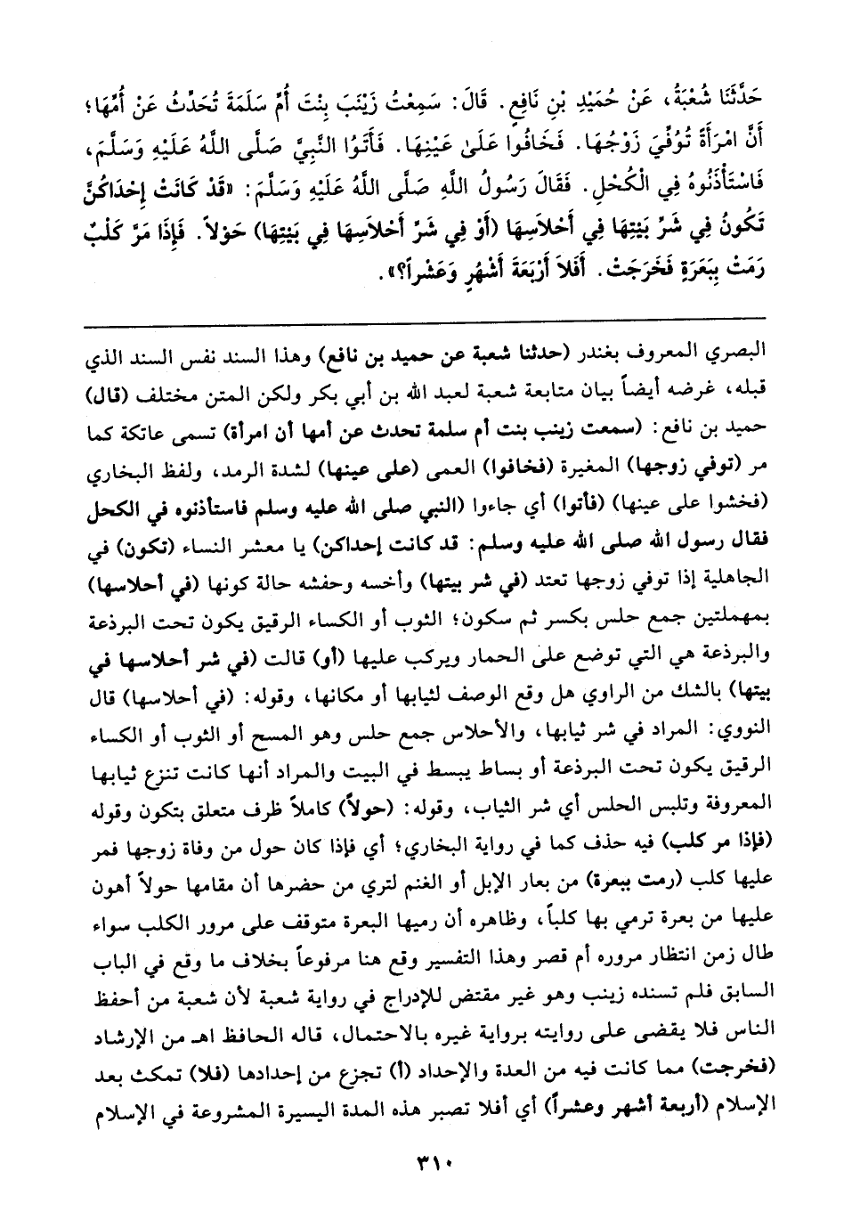 حَدَّثَنَا شُعْبَةُ، عن حُمَيدِ بْنِ نَافِعٍ. قَال: سَمِعْتُ زَينَبَ بِنْتَ أُمِّ سَلَمَةَ تُحَدِّثُ عَنْ أُمِّهَا؛ أَنَّ امْرَأَةَ تُوُفِّيَ زوْجُهَا. فَخَافُوا عَلَى عَينِهَا. فَأَتَوُا النَّبِيَّ صَلَّى الله عَلَيهِ وَسَلَّمَ، فَاسْتَأذَنُوهُ فِي الْكُحْلِ. فَقَال رَسُولُ الله صَلَّى الله عَلَيهِ وَسَلَّمَ: "قَدْ كَانَتْ إِحْدَاكُنَّ تَكُونُ فِي شَرِّ بَيتِهَا فِي أَحْلاسِهَا (أَوْ فِي شَرِّ أَحْلاسِهَا فِي بَيتِهَا) حَوْلًا. فَإذَا مَرَّ كَلْبٌ رَمَتْ بِبَعَرَةٍ فَخَرَجَتْ. أَفَلا أَرْبَعَةَ أَشْهُرٍ وَعَشْرًا؟ "