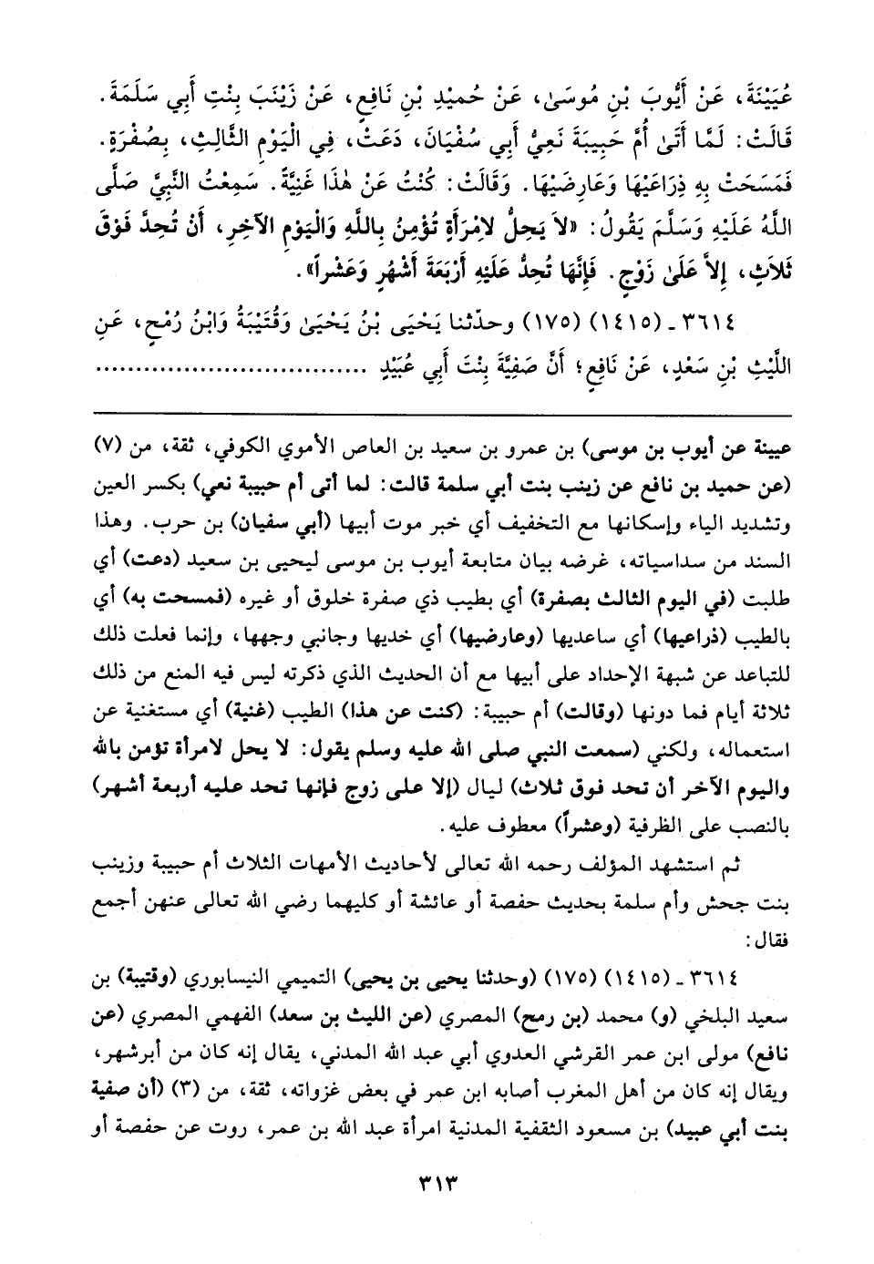 عُيَينَةَ، عَنْ أَيُّوبَ بْنِ مُوسَى، عَنْ حُميدِ بنِ نَافِعٍ، عن زَينَبَ بِنْتِ أَبِي سَلَمَةَ. قَالتْ: لَمَّا أَتى أُمَّ حَبِيبَةَ نَعِيُّ أَبِي سُفْيَانَ، دَعَتْ، فِي الْيَوْمِ الثَّالِثِ، بِصُفْرَةٍ. فَمَسَحَتْ بِهِ ذِرَاعَيهَا وَعَارِضَيهَا. وَقَالتْ: كُنْتُ عَنْ هذَا غَنِيَّةَ. سَمِعْتُ النَّبِيَّ صَلَّى الله عَلَيهِ وَسَلَّمَ يَقُولُ: "لَا يَحِلُّ لامْرَأَةٍ تُؤْمِنُ بِاللهِ وَالْيَوْمِ الآخِرِ، أَنْ تُحِدَّ فَوْقَ ثَلاثٍ، إلا عَلَى زَوْجٍ. فَإِنَّهَا تُحِدُّ عَلَيهِ أَرْبَعَةَ أَشْهُرٍ وَعَشْرًا".