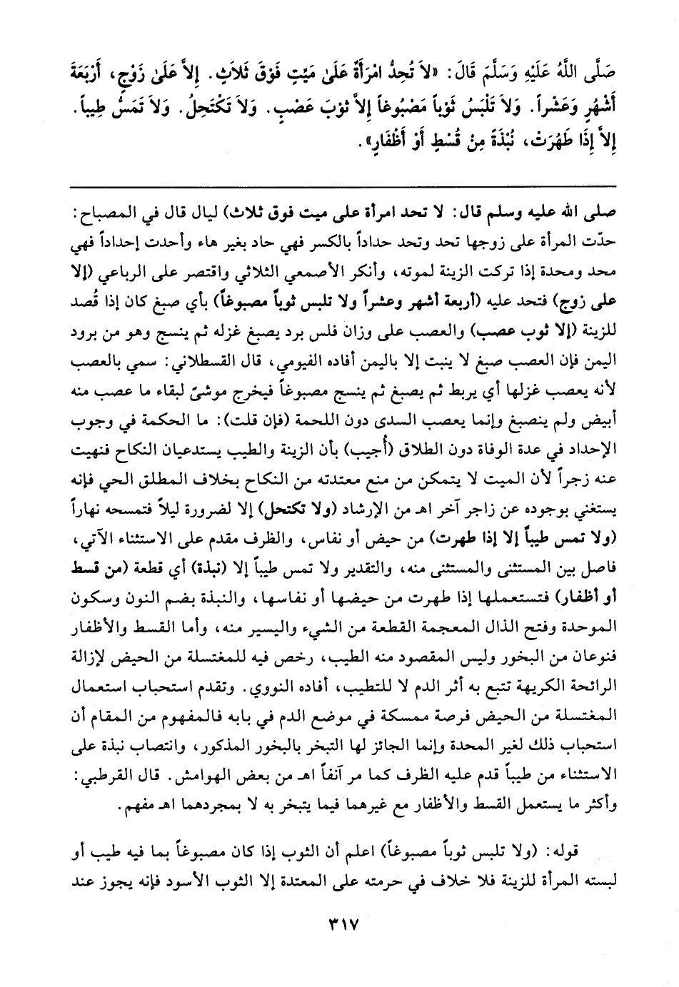 صَلَّى الله عَلَيهِ وَسَلَّمَ قَال: "لَا تُحِدُّ امْرَأَةٌ عَلَى مَيِّتٍ فَوْقَ ثَلاثٍ. إلا عَلَى زَوْجٍ، أَرْبَعَةَ أَشْهُرٍ وَعَشْرًا. وَلَا تَلْبَسُ ثَوْبًا مَصْبُوغًا إِلَّا ثوْبَ عَصْبٍ. وَلَا تَكْتَحِلُ. وَلَا تَمَسُّ طِيبًا. إلا إِذَا طَهُرَتْ، نُبْذَةً مِنْ قُسْطٍ أَوْ أَظْفَارٍ"