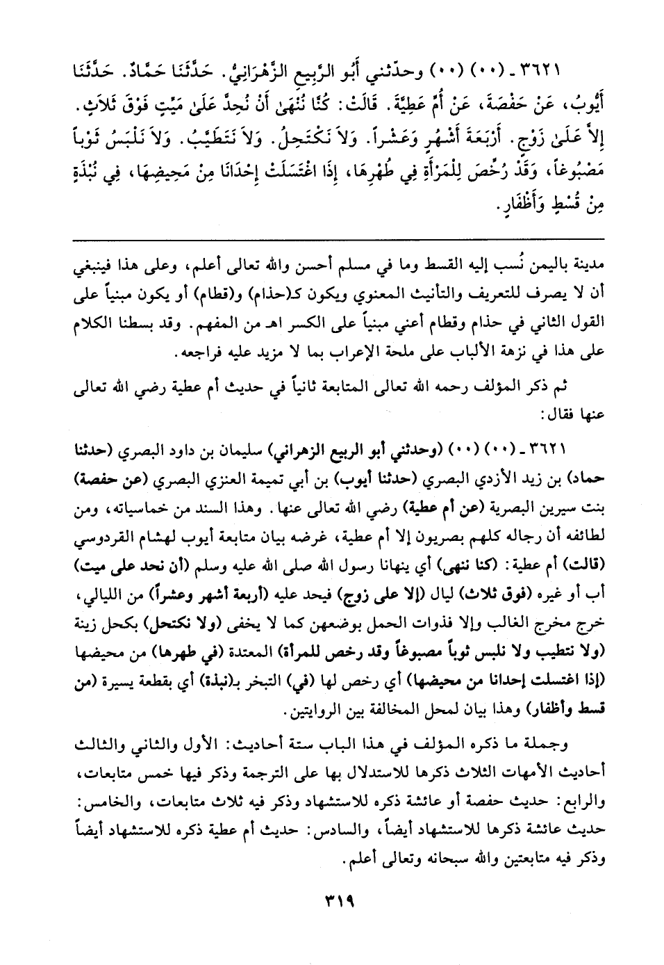 ٣٦٢١ - (٠٠) (٠٠) وحدّثني أَبُو الرَّبِيعِ الزَّهْرَانِيُّ. حَدَّثَنَا حَمَّادٌ. حَدَّثَنَا أَيُّوبُ، عَنْ حَفْصَةَ، عَنْ أُمِّ عَطِيَّةَ. قَالتْ: كُنَّا نُنْهَى أَنْ نُحِدَّ عَلَى مَيِّتٍ فَوْقَ ثَلاثٍ. إِلَّا عَلَى زَوْجٍ. أَرْبَعَةَ أَشْهُر وَعَشْرًا. وَلَا نَكْتَحِلُ. وَلَا نَتَطَيَّبُ. وَلَا نَلْبَسُ ثَوْبًا مَصْبُوغًا، وَقَدْ رُخِّصَ لِلْمَرأَةِ فِي طُهْرِهَا، إِذَا اغْتَسَلَتْ إحْدَانَا مِنْ مَحِيضِهَا، فِي نُبْذَةٍ مِنْ قُسْطٍ وَأَظْفَارٍ