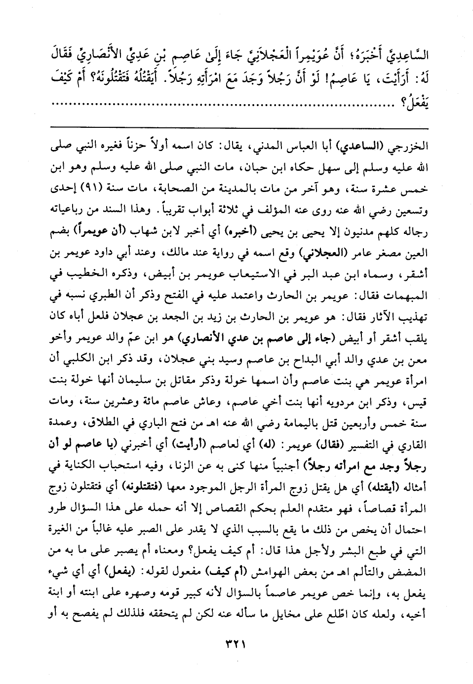 السَّاعِدِيَّ أَخْبَرَهُ؛ أَنَّ عُوَيمِرًا الْعَجْلانيَّ جَاءَ إِلَى عَاصِمِ بْنِ عَدِيٍّ الأَنْصَارِيِّ فَقَال لَهُ: أَرَأَيتَ، يَا عَاصِمُ! لَوْ أَنَّ رَجُلًا وَجَدَ مَعَ امْرَأَتِهِ رَجُلًا. أَيَقْتُلُهُ فَتَقْتُلُونَهُ؟ أَمْ كَيفَ يَفْعَلُ؟