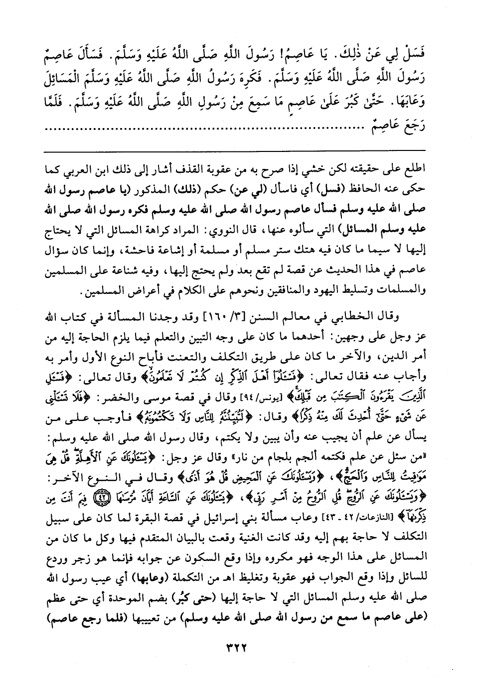 وقال الخطابي في معالم السنن [٣/ ١٦٠] وقد وجدنا المسألة في كتاب الله عزَّ وجلَّ على وجهين: أحدهما ما كان على وجه التبين والتعلم فيما يلزم الحاجة إليه من أمر الدين، والآخر ما كان على طريق التكلف والتعنت فأباح النوع الأول وأمر به وأجاب عنه فقال تعالى: {فَاسْأَلُوا أَهْلَ الذِّكْرِ إِنْ كُنْتُمْ لَا تَعْلَمُونَ} وقال تعالى: {فَاسْأَلِ الَّذِينَ يَقْرَءُونَ الْكِتَابَ مِنْ قَبْلِكَ} [يونس: ٩٤] وقال في تصة موسى والخضر: {فَلَا تَسْأَلْنِي عَنْ شَيءٍ حَتَّى أُحْدِثَ لَكَ مِنْهُ ذِكْرًا} وقال: {لَتُبَيِّنُنَّهُ لِلنَّاسِ وَلَا تَكْتُمُونَهُ} فأوجب على من يسأل عن علم أن يجيب عنه وأن يبين ولا يكتم، وقال رسول الله صلى الله عليه وسلم: "من سئل عن علم فكتمه ألجم بلجام من نار" وقال عزَّ وجلَّ: {يَسْأَلُونَكَ عَنِ الْأَهِلَّةِ قُلْ هِيَ مَوَاقِيتُ لِلنَّاسِ وَالْحَجِّ}، {وَيَسْأَلُونَكَ عَنِ الْمَحِيضِ قُلْ هُوَ أَذًى} وقال في النوع الآخر: {وَيَسْأَلُونَكَ عَنِ الرُّوحِ قُلِ الرُّوحُ مِنْ أَمْرِ رَبِّي}، {يَسْأَلُونَكَ عَنِ السَّاعَةِ أَيَّانَ مُرْسَاهَا (٤٢) فِيمَ أَنْتَ مِنْ ذِكْرَاهَا} [النازعات: ٤٢، ٤٣] وعاب مسألة بني إسرائيل في قصة البقرة لما كان على سبيل التكلف لا حاجة بهم إليه وقد كانت الغنية وقعت بالبيان المتقدم فيها وكل ما كان من المسائل على هذا الوجه فهو مكروه وإذا وقع السكون عن جوابه فإنما هو زجر وردع للسائل وإذا وقع الجواب فهو عقوبة وتغليظ اهـ من التكملة (وعابها) أي عيب رسول الله صلى الله عليه وسلم المسائل التي لا حاجة إليها (حتى كبُر) بضم الموحدة أي حتى عظم (على عاصم ما سمع من رسول الله صلى الله عليه وسلم) من تعييبها (فلما رجع عاصم)