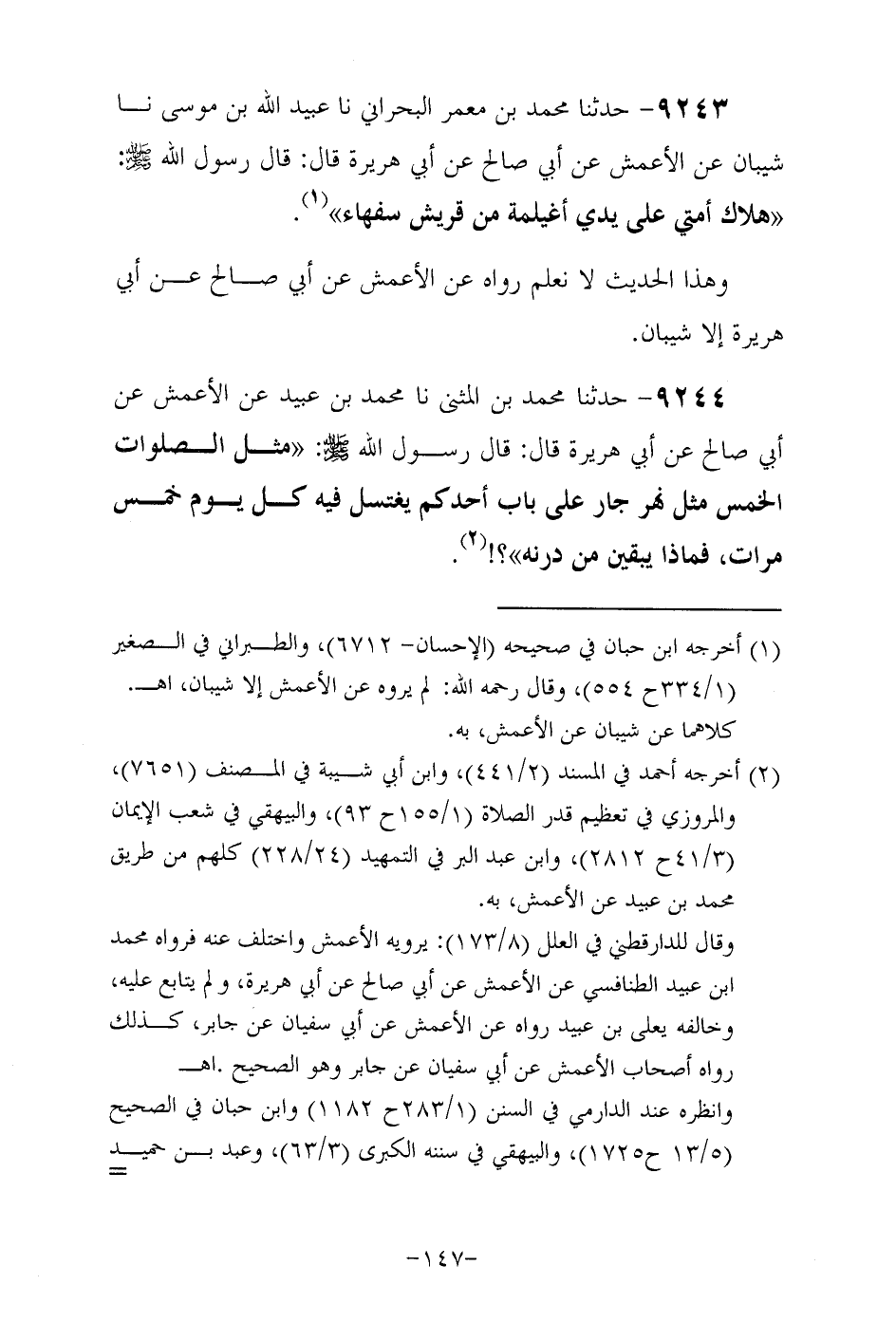 9244- حدثنا محمد بن المُثَنَّى حَدَّثَنا مُحَمَّد بن عبيد عَنِ الأَعْمَشِ , عَنْ أَبِي صَالِحٍ , عَنْ أَبِي هُرَيْرَةَ رَضِيَ اللهُ عَنْهُ , قَالَ: قَالَ رَسُولُ اللَّهِ صَلَّى اللهُ عَلَيْهِ وَسَلَّمَ مثل الصوات الخمس مثل نهر جار على باب أحدكم يغتسل فيه كل يوم خمس مرات فماذا يبقين من درنه.