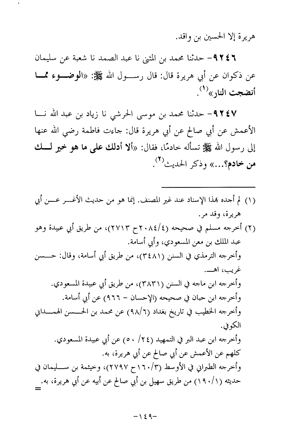 9246- حدثنا محمد بن المُثَنَّى حَدَّثَنا عبد الصَّمَد حدثنا شُعْبة عن سليمان عن ذكوان , عن أبي هريرة رَضِيَ اللهُ عَنْهُ , قَالَ: قَالَ رَسُولُ اللَّهِ صَلَّى اللهُ عَلَيْهِ وَسَلَّمَ الوضوء مما أنضجت النار.