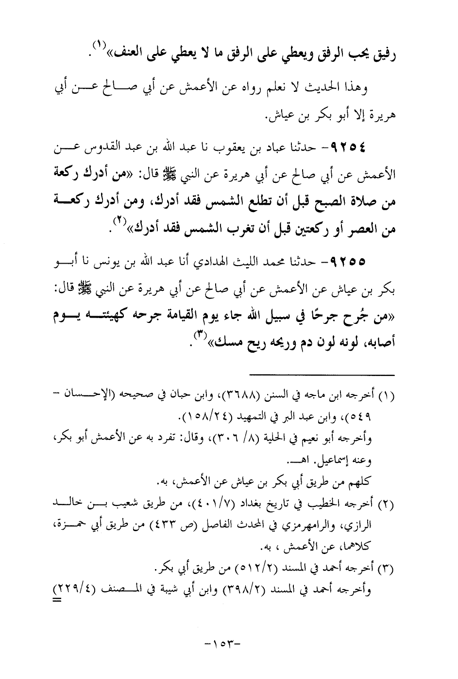 9255- حدثنا محمد بن الليث الهدادي حدثنا عَبْد الله بن يونس حدثنا أَبُو بَكْر بْنُ عَيَّاشٍ عَنِ الأَعْمَشِ عَنْ أَبِي صالحٍ , عَنْ أَبِي هُرَيْرَةَ رَضِيَ اللهُ عَنْهُ , عَنِ النَّبِيِّ صَلَّى اللهُ عَلَيْهِ وَسَلَّمَ قال من جرح جرحا في سبيل الله جاء يوم القيامة جرحه كهيئته يوم أصابه لونه لون دم وريحه ريح مسك