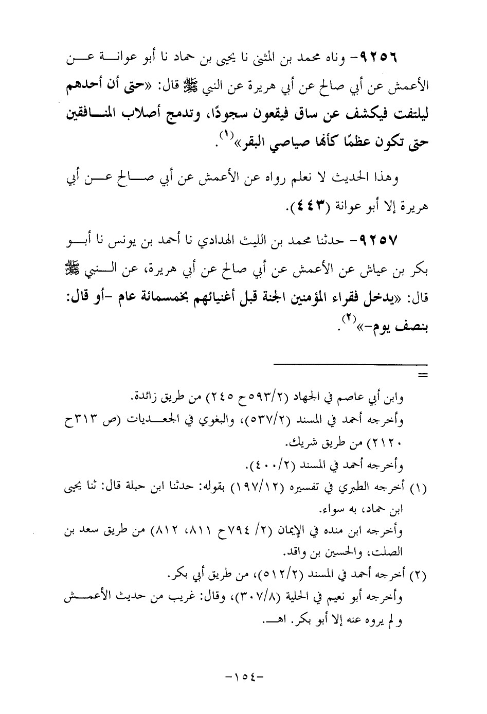 9256- وحدثناه محمد بن المثنى حدثنا يحيى بن حماد حدثنا أَبُو عَوَانَةَ عَنِ الأَعْمَشِ عَنْ أَبِي صالحٍ , عَنْ أَبِي هُرَيْرَةَ رَضِيَ اللهُ عَنْهُ , عَنِ النَّبِيِّ صَلَّى اللهُ عَلَيْهِ وَسَلَّمَ قال حتى أن أحدهم ليلتفت فيكشف عن ساق فيقعون سجودا وتدمج أصلاب المنافقين حتى تكون عظما كأنها صياصي البقر.