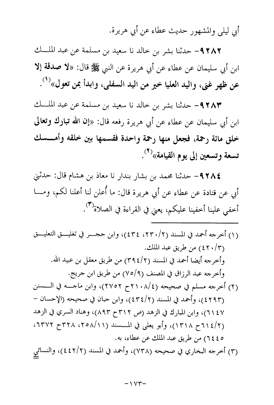 9283- حدثنا بشر بن خالد حَدَّثَنا سعيد بن مسلمة عن عَبْدُ الْمَلِكِ بْنُ أَبِي سُلَيْمَانَ , عَنْ عَطَاء , عن أبي هريرة رَضِيَ اللهُ عَنْهُ , رفعه قال إنَّ الله تبارك وتعالى خلق مئة رحمة فجعل منها رحمة واحدة فقسمها بين خلقه وأمسك تسعة وتسعين إِلَى يَوْمِ الْقِيَامَةِ.