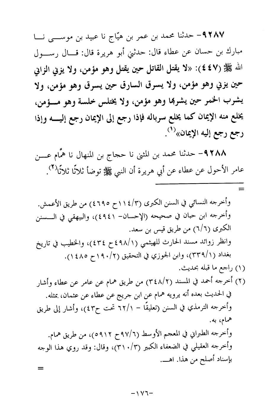 9287- حَدَّثَنا مُحَمَّد بن عمر بن هياج حَدَّثَنا عبيد بن موسى حَدَّثَنا مبارك بن حسان , عن عَطَاء قال: حدثني أبو هريرة قَالَ: قَالَ رَسُولُ اللَّهِ صَلَّى اللهُ عَلَيْهِ وَسَلَّمَ لا يقتل القاتل حين يقتل وهو مؤمن ولا يزني الزاني حين يزني وهو مؤمن ولا يسرق السارق حين يسرق وهو مؤمن ولا يشرب الخمر حين يشربها وهو مؤمن ولا يختلس خلسة وهو مؤمن يخلع منه الإيمان كما يخلع سرباله , فإذا رجع إلى الإيمان رجع إليه , وإذا رجع رجع إليه الإيمان.