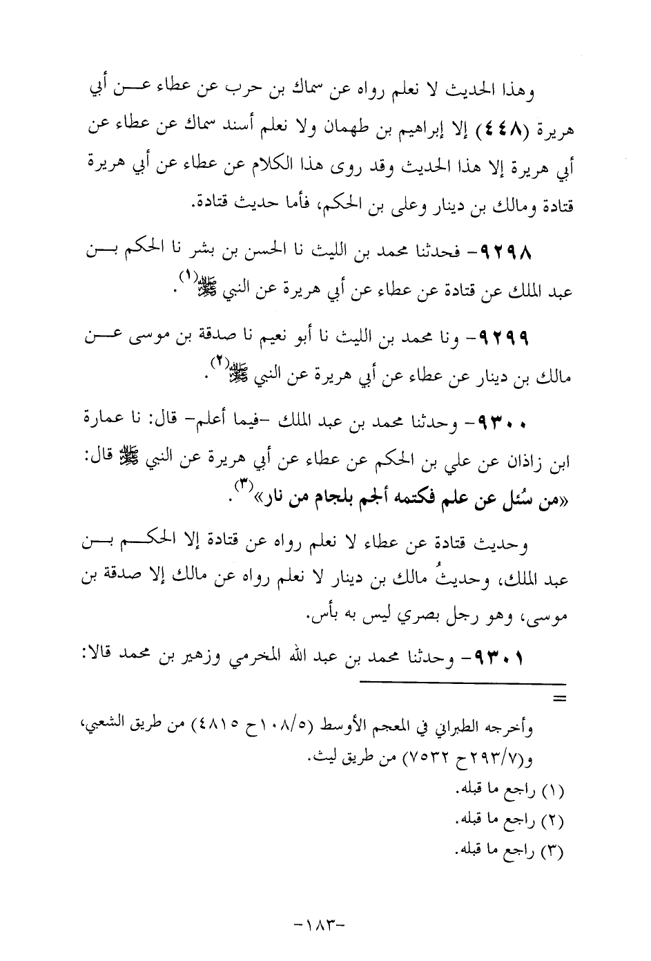 9300- وَحَدَّثَنا مُحَمَّد بن عبد الملك فيما أعلم قال: حدثنا عمارة بن زاذان عن علي بن الحكم , عن عَطَاء , عَنْ أَبِي هُرَيْرَةَ رَضِيَ اللهُ عَنْهُ , عَنِ النَّبِيِّ صَلَّى اللهُ عَلَيْهِ وَسَلَّمَ قَالَ مَنْ سئل عن علم فكتمه ألجم بلجام من نار.