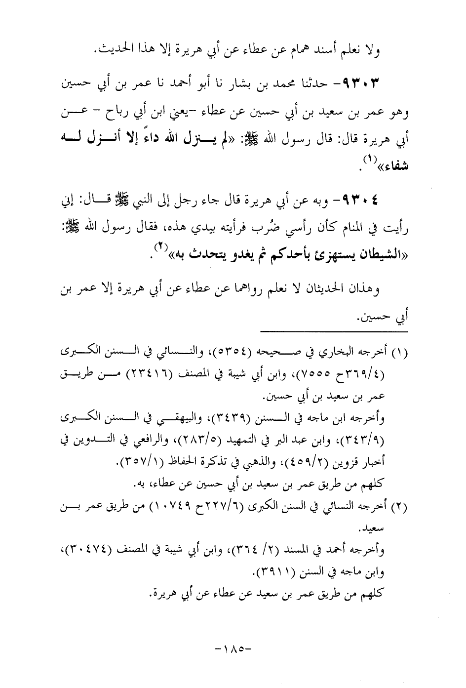 9303- حدثنا مُحَمَّد بن بشار حَدَّثَنا أبو أحمد حَدَّثَنا عمر بن أبي حسين وهو عمر بن سعيد بن أبي حسين , عن عَطَاء يعني ابن أبي رباح , عن أبي هريرة رَضِيَ اللهُ عَنْهُ , قَالَ: قَالَ رَسُولُ اللَّهِ صَلَّى اللهُ عَلَيْهِ وَسَلَّمَ لم ينزل الله داء إلا أنزل له شفاء.