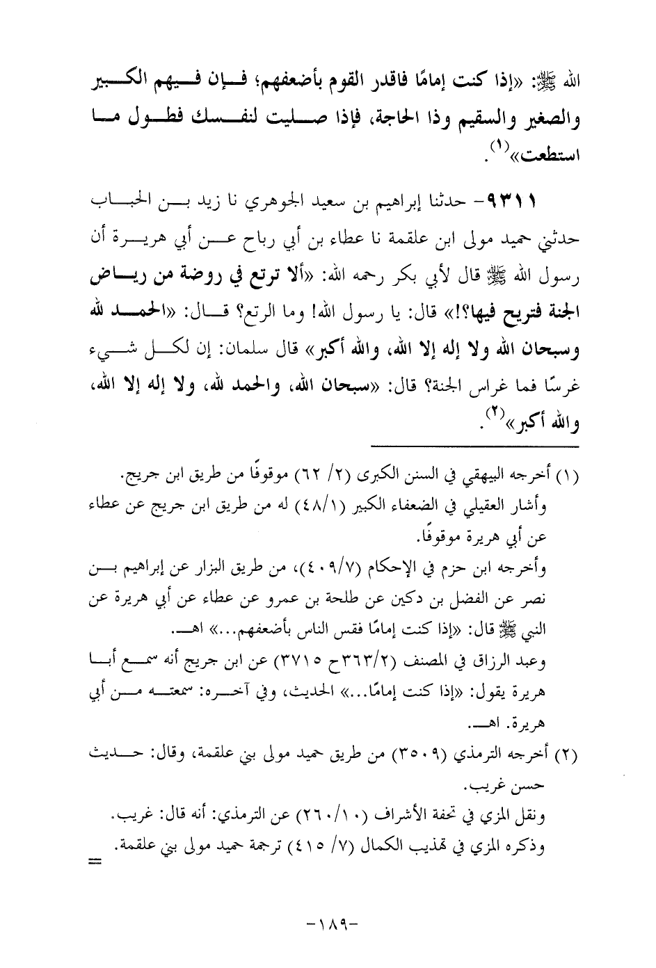 9311- حَدَّثَنا إبراهيم بن سعيد الجوهري حَدَّثَنا زيد بن الحباب حَدَّثَنِي حميد مولى ابن علقمة حَدَّثَنا عَطَاء بن أبي رَبَاح , عن أبي هريرة رَضِيَ اللهُ عَنْهُ , أَنَّ رَسُولَ اللَّهِ صَلَّى اللهُ عَلَيْهِ وَسَلَّمَ قال لأبي بكر رحمه الله ألا ترتع في روضة من رياض الجنة فتريح فيها قال يا رسول الله وما الرتع قال الحمد لله وسبحان الله ولا إله إلا الله والله أكبر قال سلمان إن لكل شيء غرسا فما غراس الجنة قال سُبْحَانَ اللَّهِ وَالْحَمْدُ لِلَّهِ وَلا إِلَهَ إِلا الله والله أكبر.