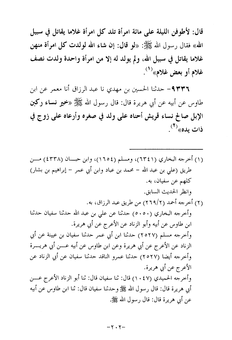 9336- حَدَّثَنا الحُسَين بن مهدي حَدَّثَنا عبد الرزاق أَخْبَرنَا مَعْمَرٌ عَنِ ابْنِ طَاوُسٍ , عَنْ أَبِيهِ عَنِ أبي هريرة رَضِيَ اللهُ عَنْهُ , قَالَ: قَالَ رَسُولُ اللَّهِ صَلَّى اللهُ عَلَيْهِ وَسَلَّمَ خير نساء ركبن الإبل صالح نساء قريش أحناه على ولد في صغره وأرعاه على زوج في ذات يده.