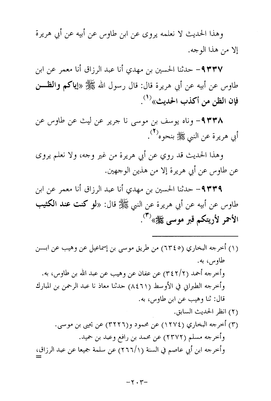 9337- حَدَّثَنا الحُسَين بْنُ مَهْدِيٍّ أَخْبَرنَا عَبْدُ الرَّزَّاقِ أَخْبَرنَا مَعْمَرٌ عَنِ ابْنِ طَاوُسٍ , عَنْ أَبِيهِ , عَنِ أبي هريرة رَضِيَ اللهُ عَنْهُ , قَالَ: قَالَ رَسُولُ اللَّهِ صَلَّى اللهُ عَلَيْهِ وَسَلَّمَ إياكم والظن فإن الظن من أكذب الحديث.
