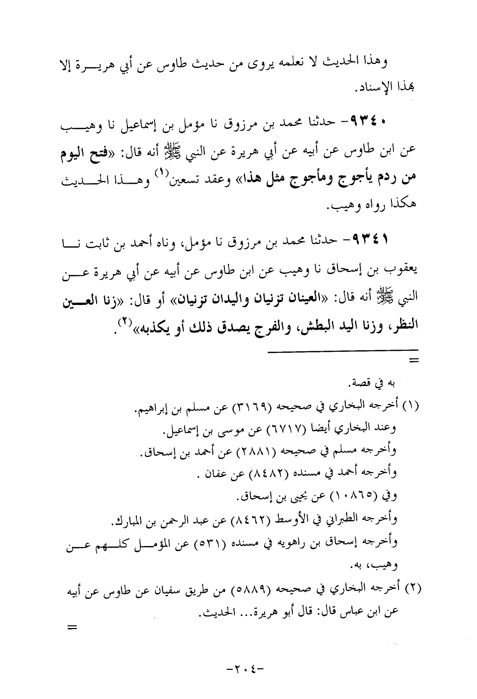 9341- حَدَّثَنا مُحَمَّد بن مرزوق حَدَّثَنا مؤمل وَحَدَّثَناه أحمد بن ثابت حَدَّثَنا يعقوب بن إسحاق حَدَّثَنا وُهَيْبٌ عَنِ ابْنِ طَاوُسٍ , عَنْ أَبِيهِ , عَنِ أَبِي هُرَيْرَةَ رَضِيَ اللهُ عَنْهُ , عَنِ النَّبِيِّ صَلَّى اللهُ عَلَيْهِ وَسَلَّمَ , أنه قال: العينان تزنيان واليدان تزنيان او قال زنا العين النظر وزنا اليد البطش والفرج يصدق ذلك او يكذبه.