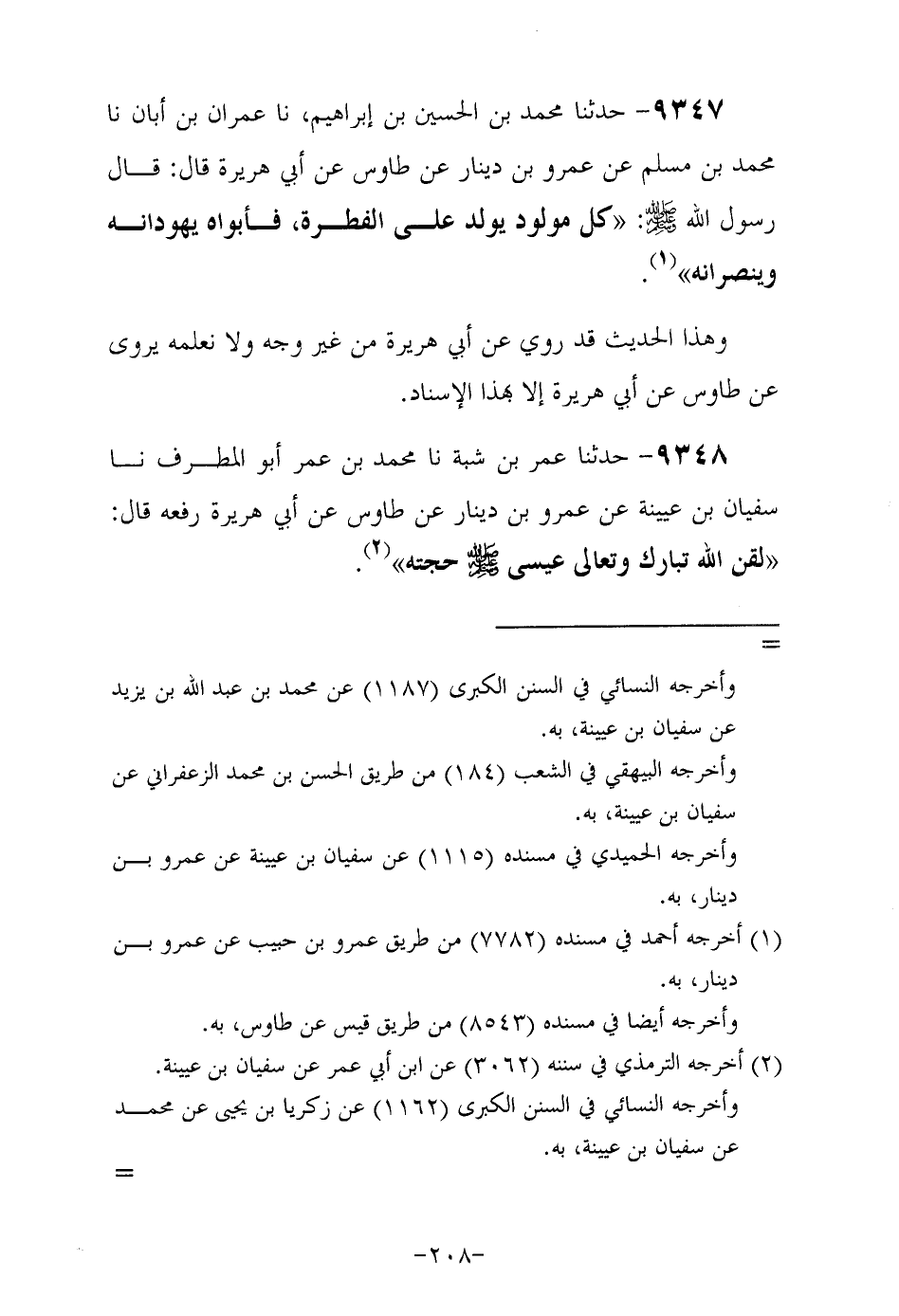 9347- حَدَّثَنا مُحَمَّد بن الحُسَين بن إبراهيم حَدَّثَنا عمران بن أبان حدثنا مُحَمَّد بْنُ مُسْلِمٍ عَنْ عَمْرِو بْنِ دِينَارٍ عن طاوس , عن أبي هريرة رَضِيَ اللهُ عَنْهُ , قَالَ: قَالَ رَسُولُ اللَّهِ صَلَّى اللهُ عَلَيْهِ وَسَلَّمَ كُلُّ مَوْلُودٍ يُولَدُ عَلَى الْفِطْرَةِ فَأَبَوَاهُ يُهَوِّدَانِهِ وينصرانه.