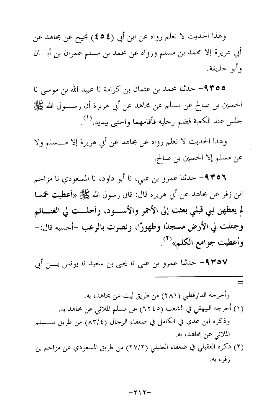 9356- حَدَّثَنا عمرو بن علي حدثنا أبو داود حدثنا المسعودي حدثنا مزاحم بن زفر عن مُجاهد عن أبي هريرة رَضِيَ اللهُ عَنْهُ , قَالَ: قَالَ رَسُولُ اللَّهِ صَلَّى اللهُ عَلَيْهِ وَسَلَّمَ أُعْطِيتُ خَمْسًا لَمْ يُعْطَهُنَّ نَبِيٌّ قَبْلِي بُعِثْتُ إِلَى الأَحْمَرِ وَالأَسْوَدِ وأحلت لي الغنائم وَجُعِلَتْ لِيَ الأَرْضُ مَسْجِدًا وَطَهُورًا وَنُصِرْتُ بِالرُّعْبِ أحسبه قال وأعطيت جوامع الكلم.