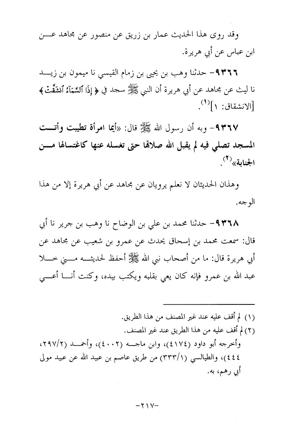 9368- حَدَّثَنا مُحَمَّدُ بْنُ علي بن الوضاح حدثنا وهب بن جرير حدثنا أَبِي قَالَ: سَمِعْتُ مُحَمَّدَ بْنَ إِسْحَاق يُحَدِّثُ عن عمرو بن شعيب عن مُجاهد عن أبي هريرة رَضِيَ اللهُ عَنْهُ , قال ما من أصحاب نبي الله صَلَّى اللهُ عَلَيْهِ وَسَلَّمَ أحفظ لحديثه مني خلا عبد الله بن عمرو فإنه كان يعي بقلبه ويكتب بيده وكنت أنا أعي بقلبي.