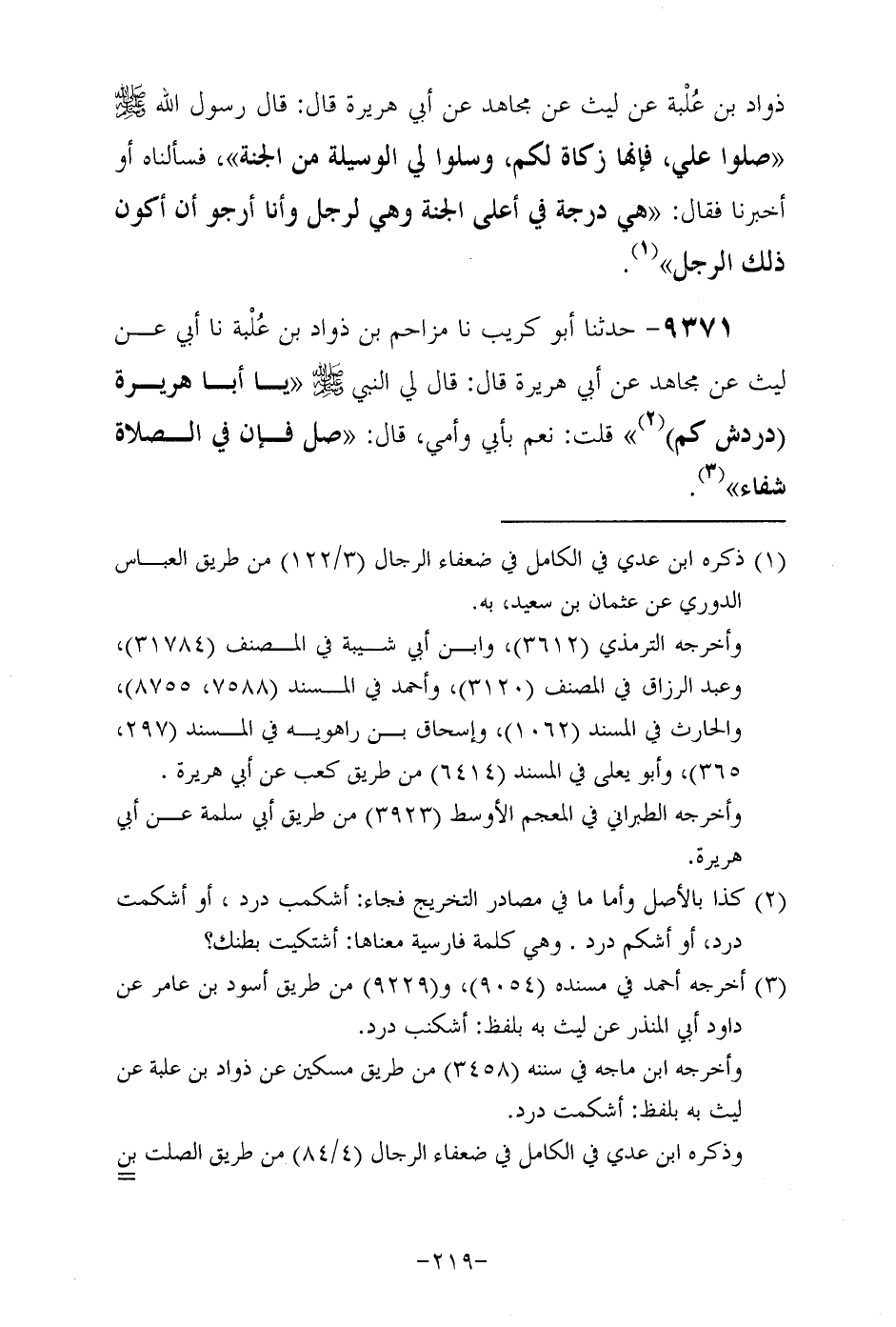 9371- حَدَّثَنا أبو كريب حدثنا مزاحم بن ذواد بن علبة حدثنا أبي عن ليث عن مُجاهد عن أبي هريرة رَضِيَ اللهُ عَنْهُ , قال: قال لي النَّبِيُّ صَلَّى اللهُ عَلَيْهِ وَسَلَّمَ يَا أَبَا هريرة (دردش كم) قلت نعم بأمي وأمي (قال صل) فإن في الصلاة شفاء