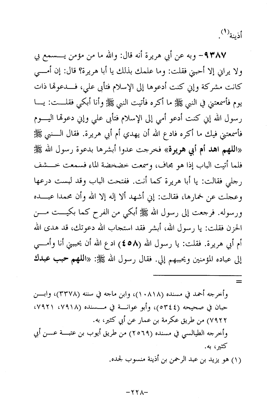 9387- وبه , عن أبي هريرة رَضِيَ اللهُ عَنْهُ , أنه قال: والله ما من مؤمن يسمع بي ولا يراني إلا أحبني، فقلت: وما علمك بذلك يا أبا هريرة؟ قال: إن أمي كانت مشركة، وإني كنت أدعوها إلى الإسلام، فتأبى علي، فدعوتها ذات يوم، فأسمعتني في النبي صلى الله عليه وسلم ما أكره، فأتيت النبي صلى الله عليه وسلم، وأنا أبكي فقلت: يا رسول الله إني كنت أدعو أمي إلى الإسلام، فتأبى علي، وإني دعوتها اليوم، فأسمعتني فيك ما أكره، فادع الله أن يهدي أم أبي هريرة، فَقَالَ النَّبِيُّ صَلَّى اللَّهُ عَلَيْهِ وَسَلَّمَ: اللَّهُمَّ اهد أم أبي هريرة، فخرجت عدوا أبشرها بدعوة رَسُولِ اللَّهِ صَلَّى اللهُ عَلَيْهِ وَسَلَّمَ، فَلَمَّا أتيت الباب إذا هو مجاف، وسمعت خضخضة الماء، فسمعت خشف رجلي، فقالت: يا أبا هريرة كما أنت، ففتحت الباب، وقد لبست درعها، وعجلت عن خمارها، فقالت: إني أَشْهَدُ أَنْ لا إِلَهَ إِلا اللَّهُ، وَأَنَّ محمدا عبده ورسول، فرجعت إِلَى رَسُولِ اللَّهِ صَلَّى اللهُ عَلَيْهِ وَسَلَّمَ أبكي من الفرح كما بكيت من الحزن، فقلت: يا رسول الله أبشر فقد استجاب الله دعوتك، قد هدى الله أم أبي هريرة، فقلت يا رسول الله ادع الله أن يحببني أنا وأمي إلى عباده المؤمنين، ويحببهم إلي، فَقَالَ رَسُولُ اللَّهِ صَلَّى اللَّهُ عَلَيْهِ وَسَلَّمَ: اللهم حبب عبدك أبا هريرة وأمه إلى عبادك المؤمنين، وحببهم إليه، قال أبو هريرة فوالله ما من مؤمن يسمع بي إلا أحبني.