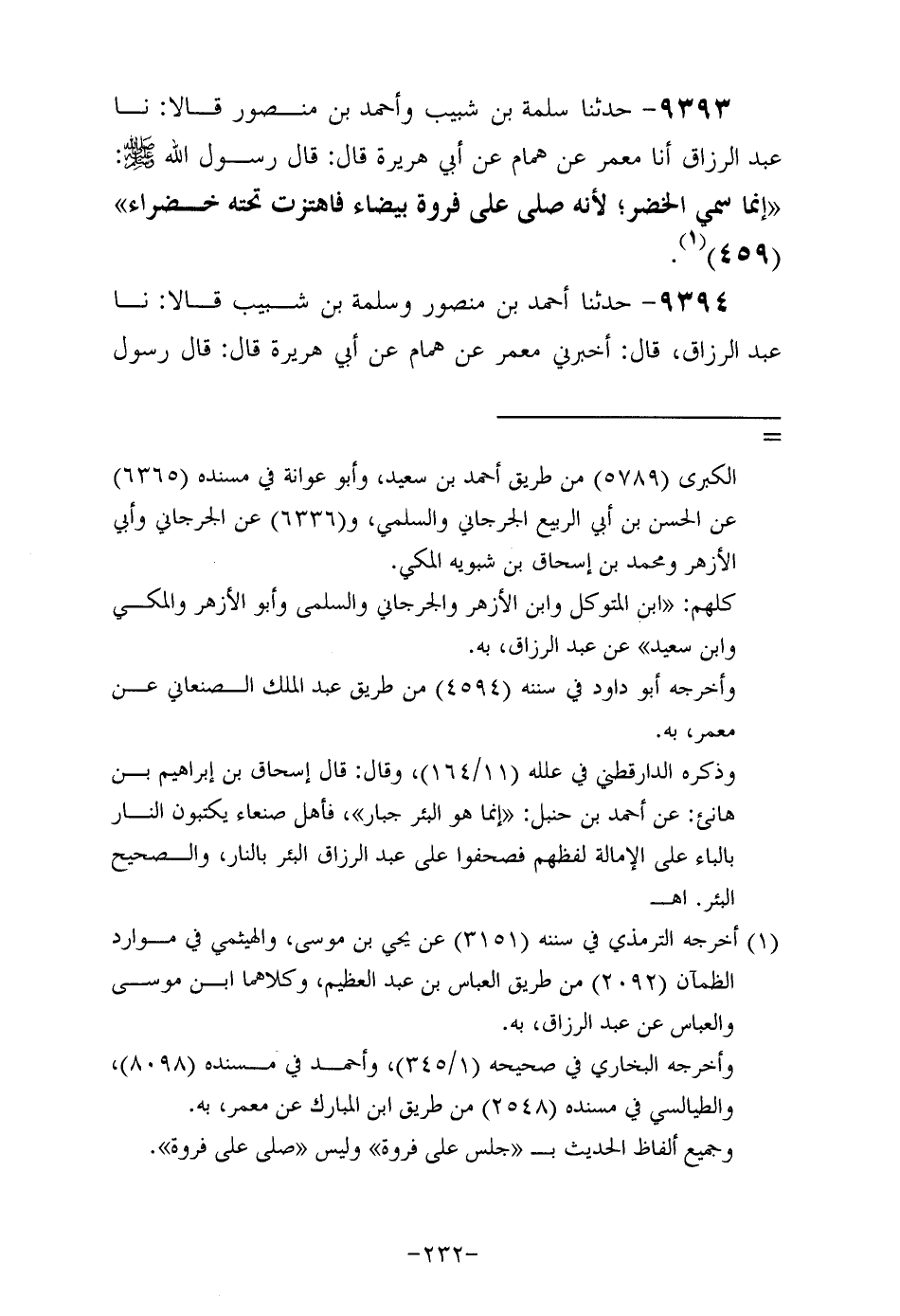 9393- حَدَّثَنا سَلَمَةُ بْنُ شَبِيبٍ وَأَحْمَدُ بْنُ مَنْصُور قالا حَدَّثَنا عبد الرزاق أَخْبَرنَا معمر عن همام , عن أبي هريرة رَضِيَ اللهُ عَنْهُ , قَالَ: قَالَ رَسُولُ اللَّهِ صَلَّى اللهُ عَلَيْهِ وَسَلَّمَ إنما سمي الخضر لأنه صلى على فروة بيضاء فاهتزت تحته خضراء.