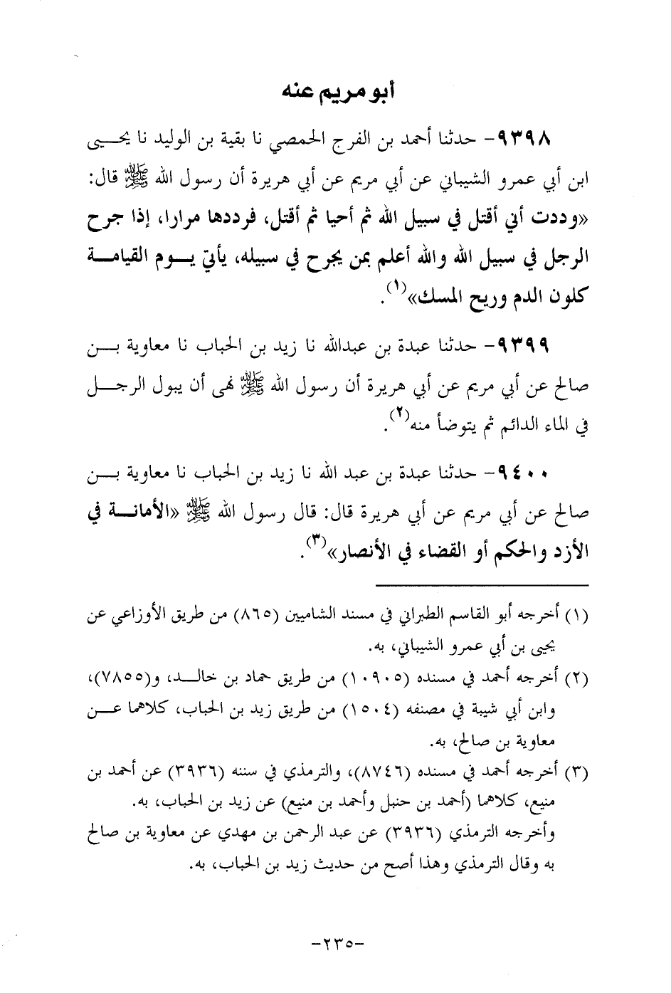 9398- حَدَّثَنا أحمد بن الفرج الحمصي حَدَّثَنا بقية بن الوليد حَدَّثَنا يحيى بن أبي عمرو الشيباني عن أبي مريم , عن أبي هريرة رَضِيَ اللهُ عَنْهُ , أَنَّ رَسُولَ اللَّهِ صَلَّى اللهُ عَلَيْهِ وَسَلَّمَ قال وددت أني أقتل في سبيل الله ثم أحيا ثم أقتل فرددها مرارا إذا جرح الرجل في سبيل الله عز وجل والله أعلم بمن يجرح في سبيله يأتي يوم القيامة كلون الدم وريح المسك.