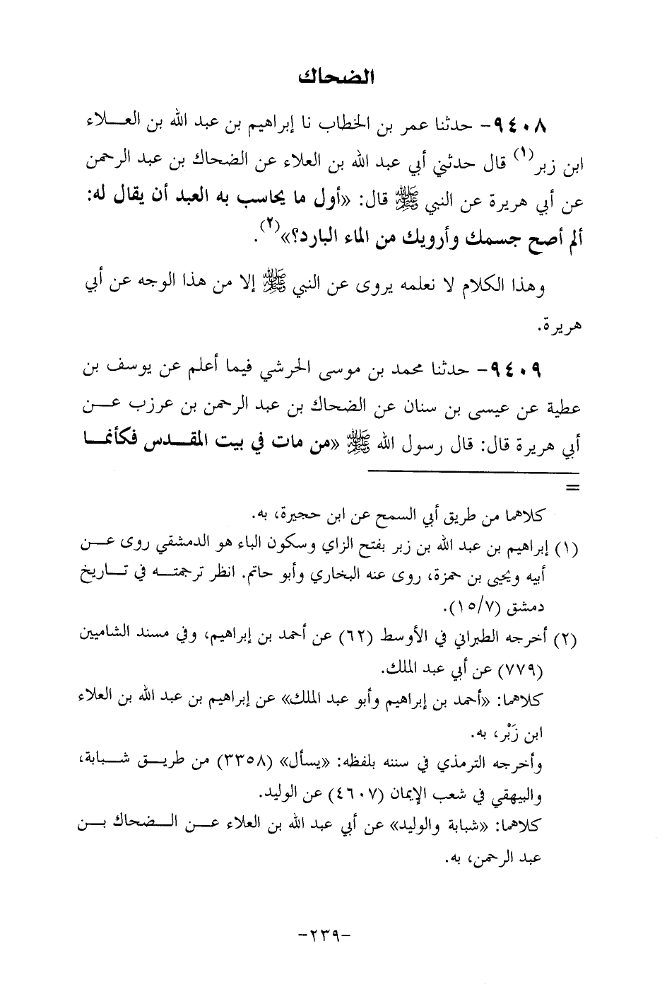 9408- حَدَّثَنا عمر بن الخطاب حَدَّثَنا إبراهيم بن عَبْدُ اللَّهِ بْنُ الْعَلاءِ بْنِ زَبْرٍ قَالَ: حدثني أبي عبد الله بن العلاء عن الضحاك بن عبد الرحمن , عَنْ أَبِي هُرَيْرَةَ رَضِيَ اللهُ عَنْهُ , عَنِ النَّبِيِّ صَلَّى اللهُ عَلَيْهِ وَسَلَّمَ قَالَ أَوَّلُ ما يحاسب به العبد أن يقال له ألم أصح جسمك وأرويك من الماء البارد.