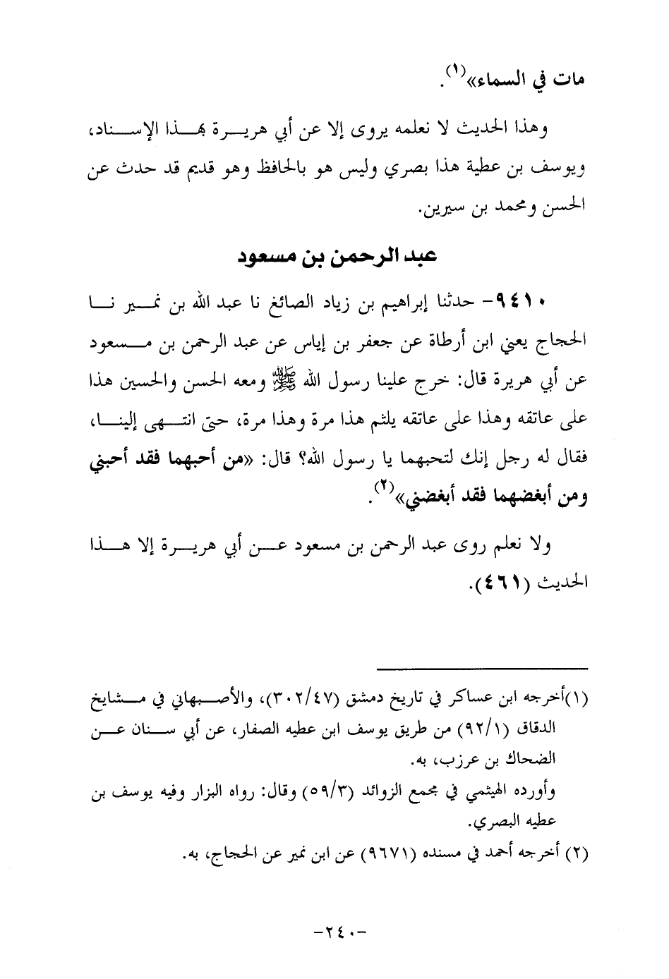 9410- حدثنا إبراهيم بن زياد الصائغ حدثنا عَبْد الله بن نمير حدثنا الحجاج يعني ابن أرطاة عن جعفر بن إياس عن عَبْد الرَّحْمن بن مسعود عن أبي هريرة رَضِيَ اللهُ عَنْهُ , قَالَ خَرَجَ عَلَيْنَا رَسُولُ الله صَلَّى اللهُ عَلَيْهِ وَسَلَّمَ ومعه الحسن والْحُسَيْن هذا على عاتقه وهذا على عاتقه يلثم هذا مرة وهذا مرة حتى انتهى إلينا فقال له رجل إنك لتحبهما يا رسولَ الله قال من