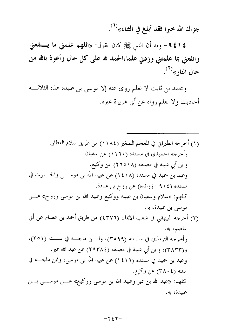 9414- وَبِهِ أَنَّ النَّبِيَّ صَلَّى اللهُ عَلَيْهِ وَسَلَّمَ كان يقول اللهم علمني ما ينفعني وانفعني بما علمتني وزذني علما الحمد لله على كل حال وأعوذ بالله من حال النار.