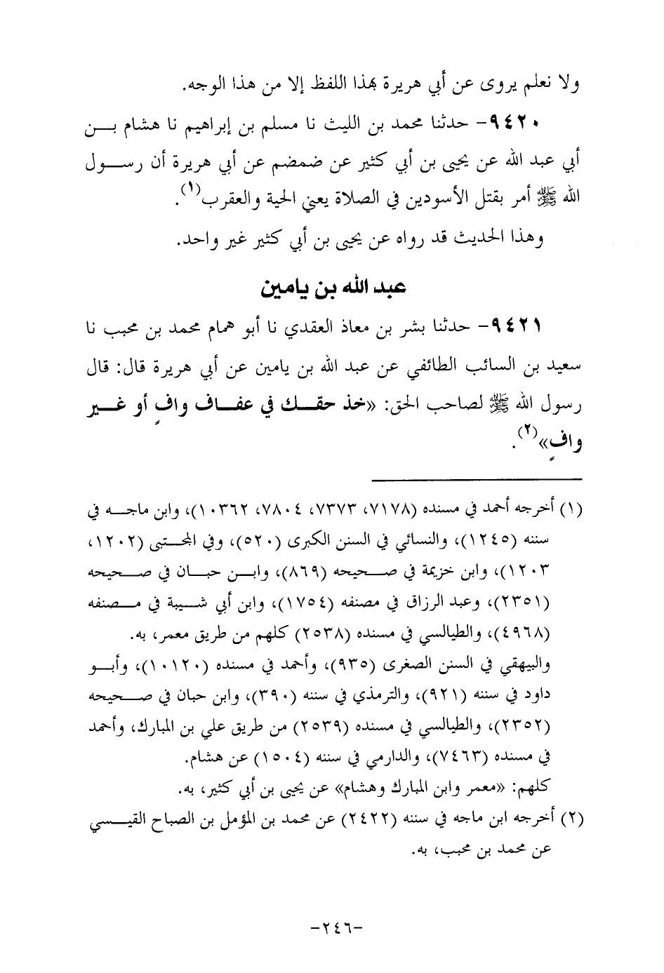 9421- حَدَّثَنا بشر بن معاذ العقدي حدثنا أبو همام محمد بن محبب حدثنا سعيد بن السائب الطائفي عن عَبْد الله بن يامين عن أبي هريرة رَضِيَ اللهُ عَنْهُ , قَالَ: قَالَ رسولُ اللَّهِ صَلَّى اللهُ عَلَيْهِ وَسَلَّمَ لصاحب الحق خذ حقك فِي عَفَافٍ وَافٍ أَوْ غَيْرِ وَافٍ.