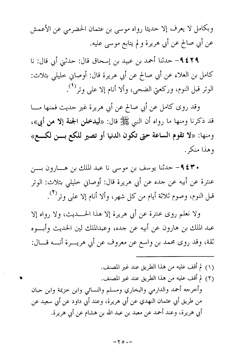 9429- حَدَّثَنا أحمد بن عبيد بن إِسْحَاق قال: حدثني أبي قال: حدثنا كامل بن العلاء عَنْ أَبِي صالحٍ , عَنْ أَبِي هُرَيْرَةَ رَضِيَ اللهُ عَنْهُ , قال أوصاني خليلي بثلاث الوتر قبل النوم وركعتي الضحى وألا انام إلا على وتر.