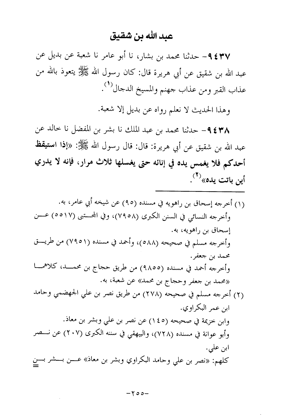 9438- حَدَّثَنا مُحَمَّد بن عبد الملك حَدَّثَنا بشر بن المفضل حَدَّثَنا خالد عن عبد الله بن شقيق , عن أبي هريرة رَضِيَ اللهُ عَنْهُ , قَالَ: قَالَ رَسُولُ اللَّهِ صَلَّى اللهُ عَلَيْهِ وَسَلَّمَ إذا استيقظ أحدكم فلا يغمس يده في إنائه حتى يغسها ثلاث مرار فإنه لا يدري أين باتت يَدِهِ.