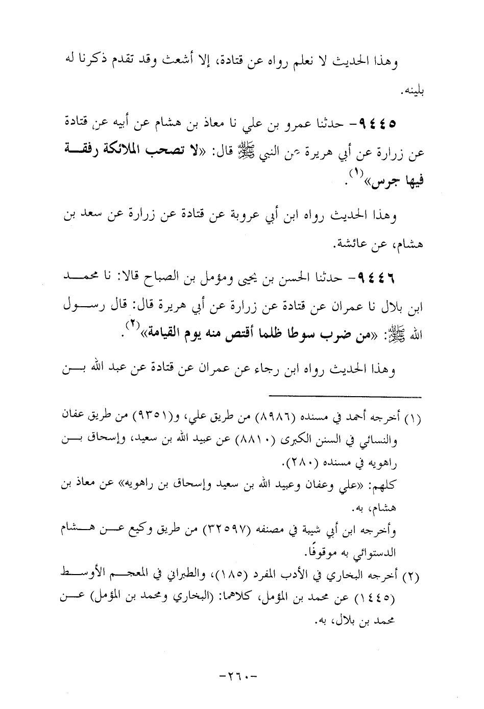 9446- حَدَّثَنا الحَسَن بن يحيى ومؤمل بن الصباح قالا حَدَّثَنا مُحَمَّد بن بلال حَدَّثَنا عمران عَنْ قَتَادَةَ عَنْ زُرَارَةَ , عَنْ أَبِي هُرَيْرَةَ رَضِيَ اللهُ عَنْهُ , قَالَ: قَالَ رَسُولُ اللَّهِ صَلَّى اللهُ عَلَيْهِ وَسَلَّمَ من ضرب سوطا ظلما أقتص منه يوم القيامة.