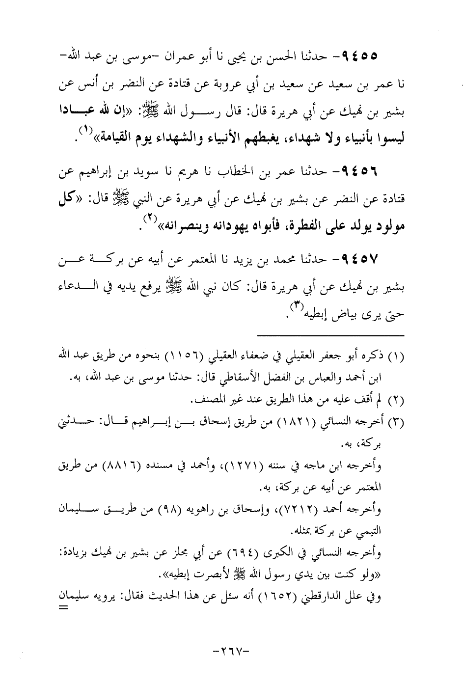 9455- حَدَّثَنا الحَسَن بن يحيى حَدَّثَنا أبو عمران موسى بن عبد الله حَدَّثَنا عُمَرُ بْنُ سَعِيدٍ عَنْ سَعِيدِ بْنِ أَبِي عروبة عَنْ قَتَادَةَ عَنِ النَّضْرِ بْنِ أَنَسٍ عَنْ بشير بن نهيك , عن أبي هريرة رَضِيَ اللهُ عَنْهُ , قَالَ: قَالَ رَسُولُ اللَّهِ صَلَّى اللهُ عَلَيْهِ وَسَلَّمَ إن لله عبادا ليسوا بأنبياء ولا شهداء يغبطهم الأنبياء والشهداء يوم القيامة.