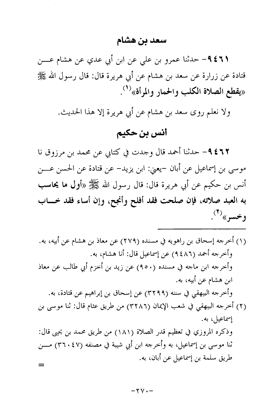 9461- حَدَّثَنا عمرو بن علي عن ابن أبي عدي عن هشام عن قتادة عن زرارة عن سعد بن هشام , عن أبي هريرة رَضِيَ اللهُ عَنْهُ , قَالَ: قَالَ رَسُولُ اللَّهِ صَلَّى اللهُ عَلَيْهِ وَسَلَّمَ يقطع الصلاة الكلب والحمار والمرأة.