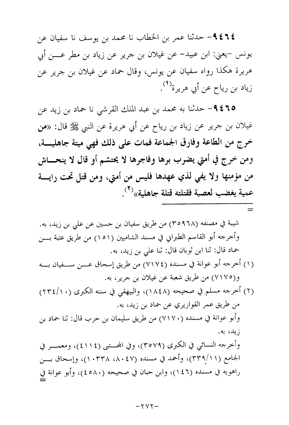 9465- حَدَّثَنا بِهِ مُحَمَّد بْنُ عَبْدِ الْمَلِكِ الْقُرَشِيُّ حَدَّثَنا حَمَّاد بن زَيْد عن غيلان بن جرير عن زياد بن رياح , عَنْ أَبِي هُرَيْرَةَ رَضِيَ اللهُ عَنْهُ , عَنِ النَّبِيِّ صَلَّى اللهُ عَلَيْهِ وَسَلَّمَ قَالَ مَنْ خرج من الطاعة وفارق الجماعة فمات على ذلك فهي ميتة جاهلية ومن خرج في أمتي يضرب برها وفاجرها لا يحتشم أو قال لا ينحاش من مؤمنها ولا يفي لذي عهدها فليس من أمتي ومن قتل تحت راية عمية يغضب لعصبة فقتلته قتلة جاهلية.