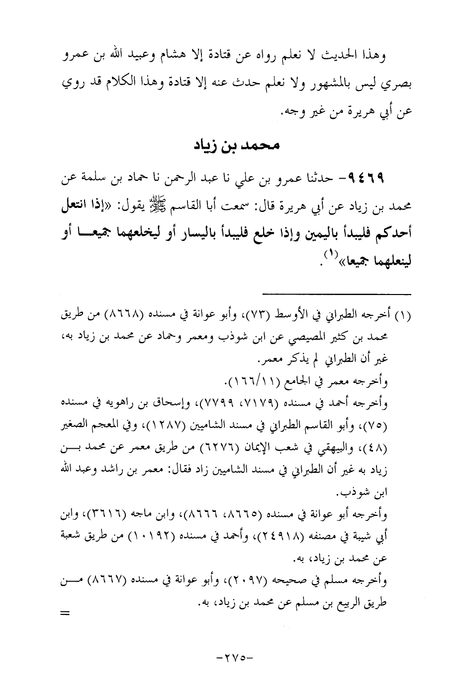 9469- حَدَّثَنا عمرو بن علي حَدَّثَنا عبد الرحمن حَدَّثَنا حمَّاد بن سَلَمة عن مُحَمَّد بن زياد , عن أبي هريرة رَضِيَ اللهُ عَنْهُ , قَالَ: سَمِعْتُ أَبَا الْقَاسِمِ صَلَّى اللهُ عَلَيْهِ وَسَلَّمَ يقول إذا انتعل أحدكم فليبدأ باليمين , وإذا خلع فليبدأ باليسار أو ليخلعهما جميعا أو لينعلهما جميعا