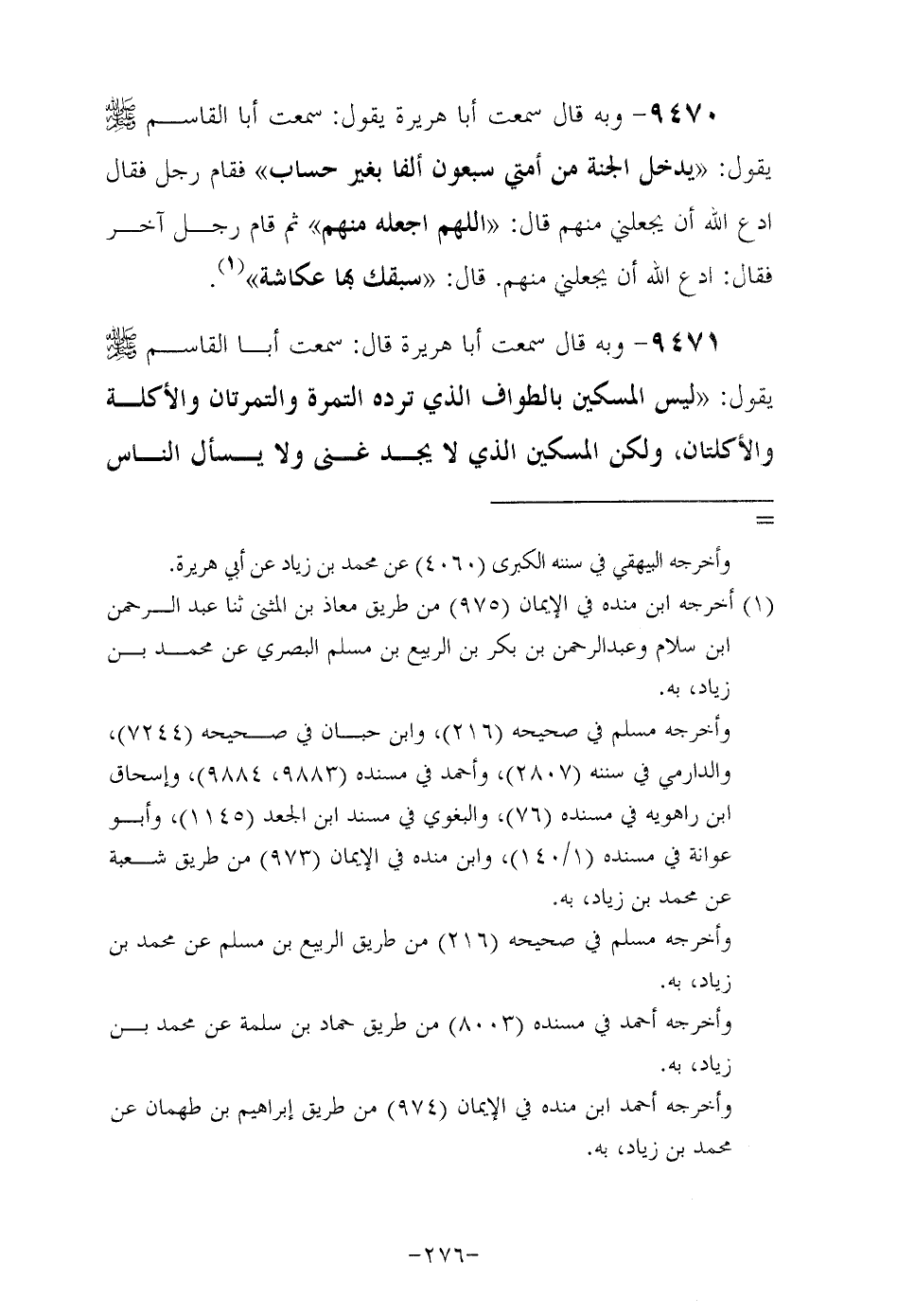 9470- وبه قال: سمعت أبا هريرة رَضِيَ اللهُ عَنْهُ يقول سَمِعْتُ أَبَا الْقَاسِمِ صَلَّى اللهُ عَلَيْهِ وَسَلَّمَ يقول يَدْخُلُ الْجَنَّةَ مِنْ أُمَّتِي سَبْعُونَ أَلْفًا بِغَيْرِ حساب فقام رجل فقال ادع الله أن يجعلني منهم قال اللهم اجعله منهم ثم قام رجل آخر فقال ادع الله أن يجعلني منهم قال سبقك بها عكاشة.