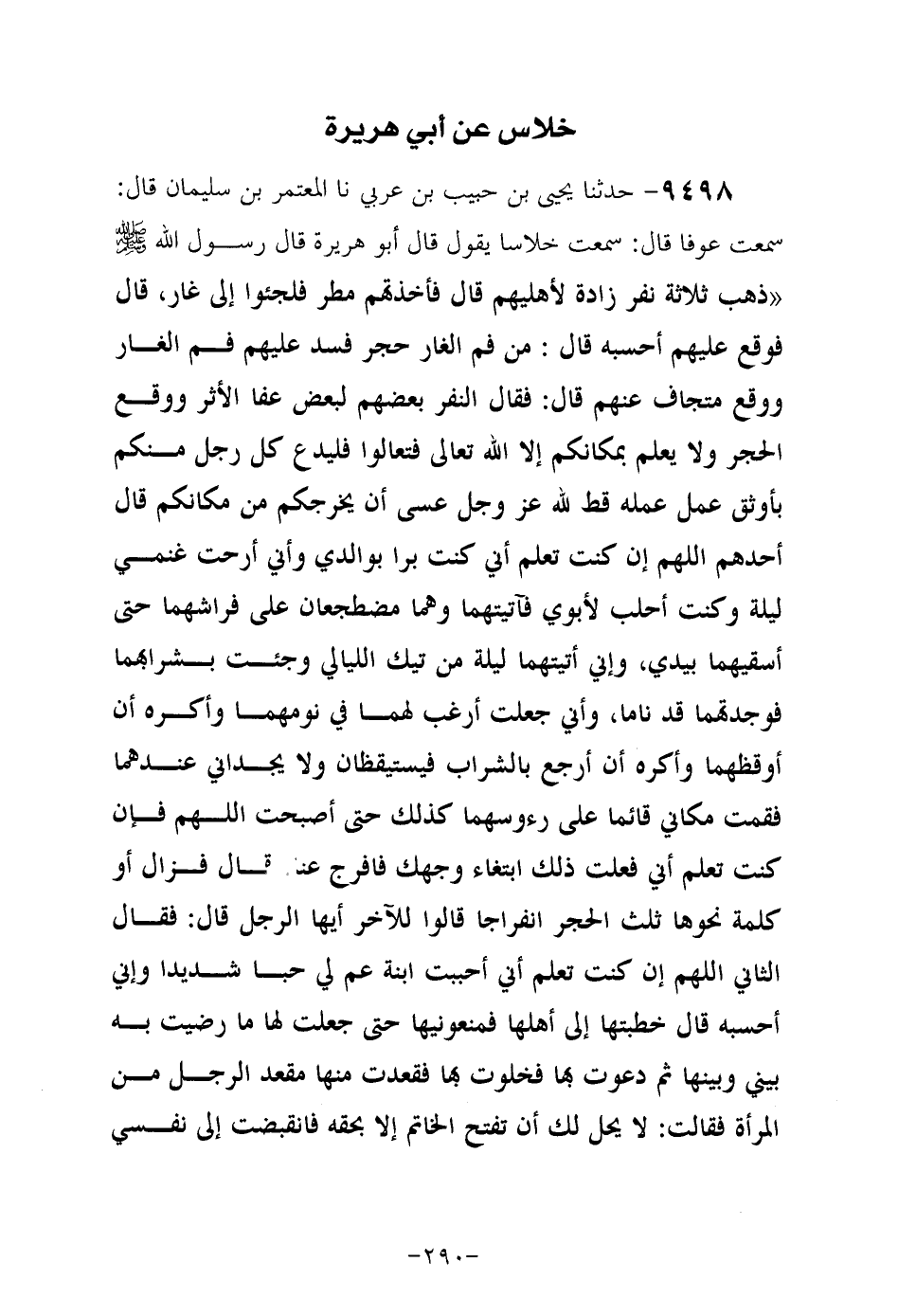 9498- حَدَّثَنا يحيى بن حبيب بن عربي حَدَّثَنا المعتمر بن سليمان قال: سمعت عوفا قال: سمعت خلاسا يقول قال أبو هريرة رَضِيَ اللَّهُ عَنْهُ قَالَ رَسُولُ اللَّهِ صَلَّى اللهُ عَلَيْهِ وَسَلَّمَ ذهب ثلاثة نفر زادة لأهلهم، قال: فأخذتهم مطر، فلجئوا إلى غار، قال: فوقع عليهم، أحسبه قال: من فم الغار حجر، فسد عليهم فم الغار، ووقع متجاف عنهم، قال: فقال النفر بعضهم لبعض: عفا الأثر، ووقع الحجر، ولا يعلم بمكانكم إلا الله تعالى، فتعالوا فليدع كل رجل منكم بأوثق عمل عمله قط لله عز وجل، عسى أن يخرجكم من مكانكم، قال أحدهم: اللهم إن كنت تعلم أني كنت برا بوالدي، وأني أرحت غنمي ليلة، وكنت أحلب لأبوي فآتيتهما وهما مضطجعان على فراشهما، حتى أسقيهما بيدي،.
