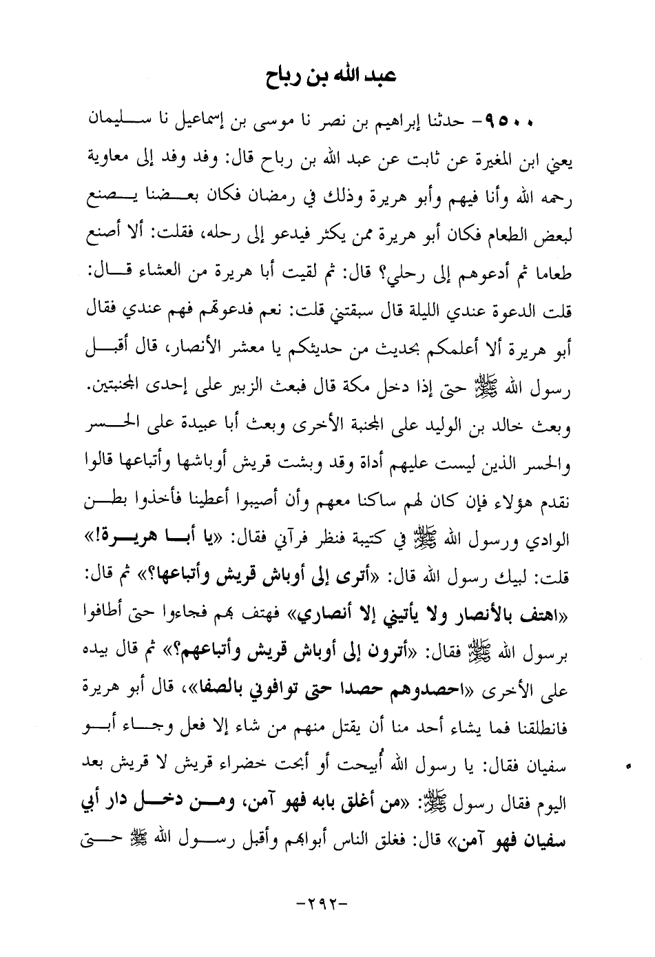 9500- حَدَّثَنا إبراهيم بن نصر حَدَّثَنا موسى بن إسماعيل حَدَّثَنا سليمان يعني ابن المغيرة، عن ثابت، عن عبد الله بن رباح قال: وفد وفد إلى معاوية رحمه الله وأنا فيهم، وأبو هريرة وذلك في رمضان، فكان بعضنا يصنع لبعض الطعام فكان أبو هريرة ممن يكثر فيدعو إلى رحله فقلت: ألا أصنع طعاما ثم أدعوهم إلى رحلي، قال ثم لقيت أبا هريرة من العشاء، قال: قلت: الدعوة عندي الليلة، قال: سبقتني؟ قلت: نعم، قال: فدعوتهم فهم عندي، فقال أبو هريرة رضي الله عنه: ألا أعلمكم بحديث من حديثكم يا معشر الأنصار، قال: أَقْبَلَ رَسُولُ اللَّهِ صَلَّى اللهُ عَلَيْهِ وَسَلَّمَ حتى إذا دخل مكة، قال: فبعث الزبير على إحدى المجنبتين، وبعث خالد بن الوليد على المجنبة الأخرى، وبعث أبا عبيدة على الحسر، والحسر الذين ليست عليهم أداة وقد وبشت قريش أوباشها وأتباعها قالوا: نقدم هؤلاء فإن كان لهم ساكنا معهم وأن أصيبوا أعطينا فأخذوا بطن الوادي وَرَسُولُ اللَّهِ صَلَّى اللَّهُ عَلَيْهِ وَسَلَّمَ فِي كتيبة فنظر فرآني فقال