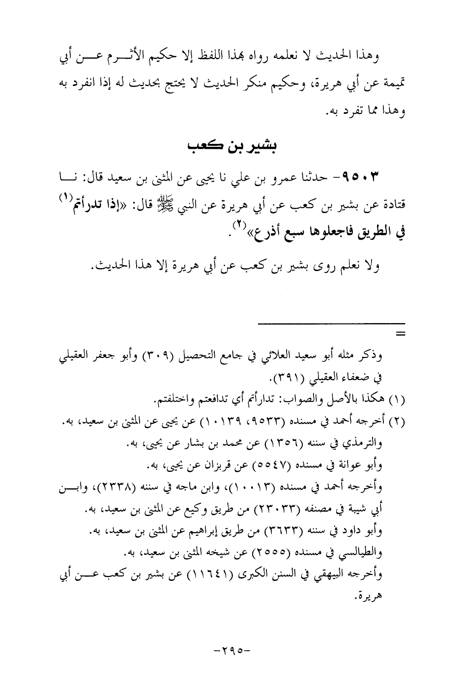 9503- حَدَّثَنا عمرو بن علي حَدَّثَنا يحيى عن المثنى بن سعيد قال: حدثنا قتادة عن بشير بن كعب , عَنْ أَبِي هُرَيْرَةَ رَضِيَ اللهُ عَنْهُ , عَنِ النَّبِيِّ صَلَّى اللهُ عَلَيْهِ وَسَلَّمَ قَالَ إِذَا تدرأتم في الطريق فاجعلهوها سبع أذرع.