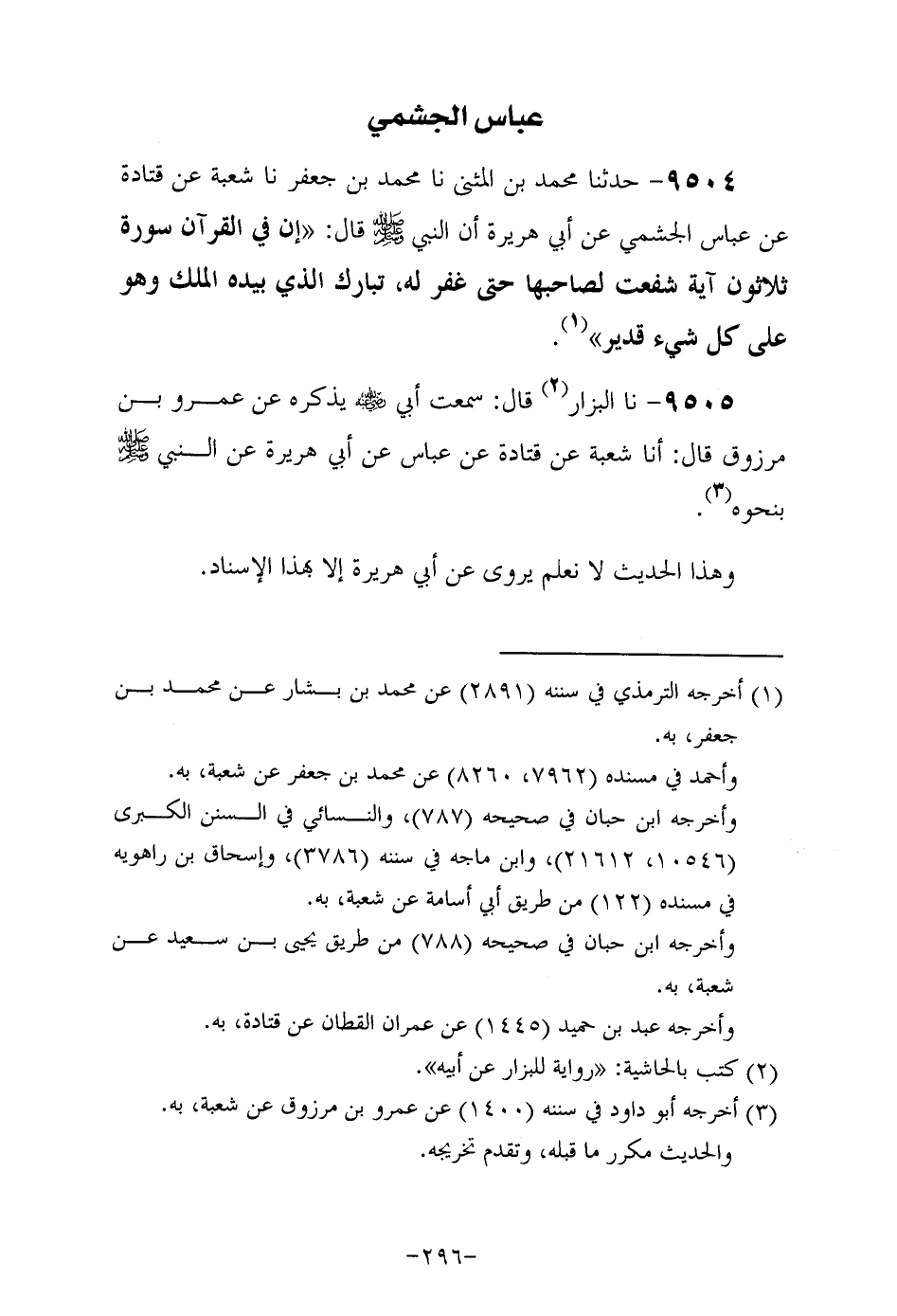 9504- حَدَّثَنا محمد بن المُثَنَّى حَدَّثَنا مُحَمَّد بن جعفر حَدَّثَنا شعبة عن قتادة عن عباس الجشمي , عن أبي هريرة رَضِيَ اللهُ عَنْهُ , أَنَّ النَّبِيَّ صَلَّى اللهُ عَلَيْهِ وَسَلَّمَ قال إن في القرآن سورة ثلاثون آية شفعت لصاحبها حتى غفر له تبارك الذي بيده الملك وهو على كل شيء قدير.