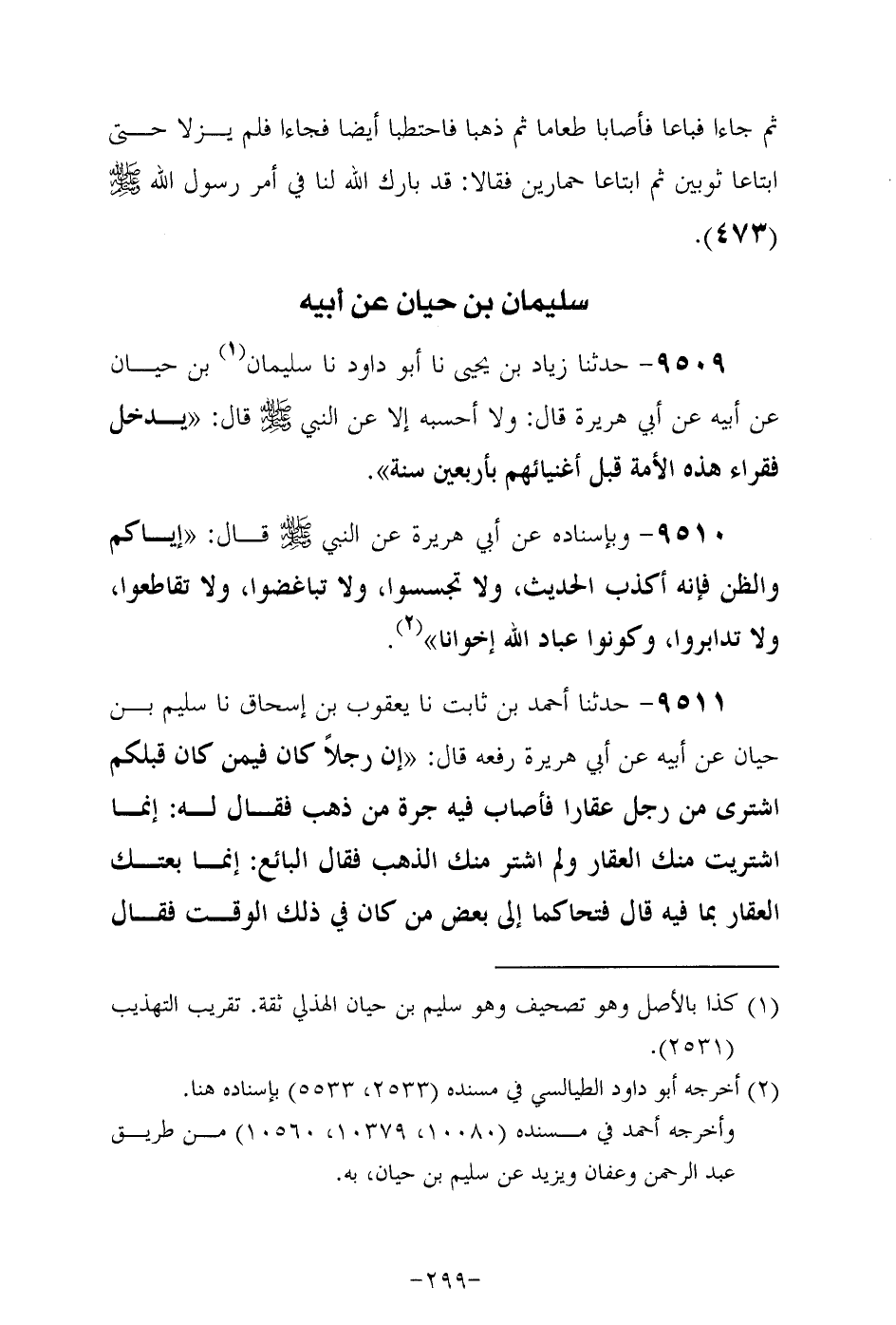 9509- حَدَّثَنا زياد بن يحيى حَدَّثَنا أبو داود حَدَّثَنا سليمان بن حيان , عن أبيه , عن أبي هريرة رَضِيَ اللهُ عَنْهُ , قال ولا أحسبه إِلا عَنِ النَّبِيِّ صَلَّى اللهُ عَلَيْهِ وَسَلَّمَ قال يدخل فقراء هذه الأمة قبل أغنيائهم بأربعين سنة.