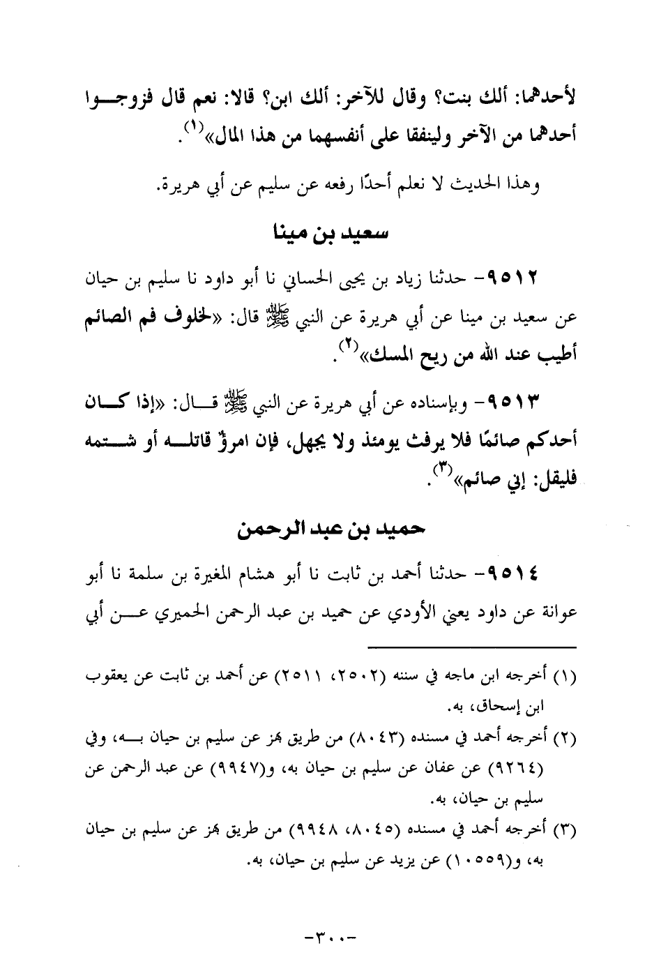 9512- حَدَّثَنا زياد بن يحيى الحساني حَدَّثَنا أبو داود حدثنا سليم بن حيان عن سعيد بن مينا , عَنْ أَبِي هُرَيْرَةَ رَضِيَ اللهُ عَنْهُ , عَنِ النَّبِيِّ صَلَّى اللهُ عَلَيْهِ وَسَلَّمَ قال لخلوف فم الصائم أطيب عند الله من ريح المسك.