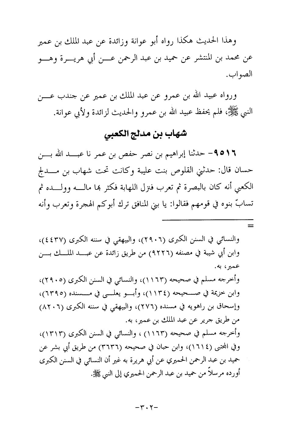 9516- حَدَّثَنا إبراهيم بن نصر حفص بن عمر (1) , حَدَّثَنا عبد الله بن حسان قال حَدَّثَنِي القلوص بنت عليبة وكانت تحت شهاب بن مدلج الكعبي أنه كان بالبصرة ثم تعرب فنزل اللهابة فكثر بها ماله وولده ثم تساب بنوه في قومهم فقالوا يا بني المنافق ترك أبوكم الهجرة وتعرب وأنه وجد ذاك في نفسه أن سب بذاك فدعا ابنه سلمان فأتاه برواحل ثلاث فحمل غلامه على زاملة وارتحل هو وابنه ثم خرج حتى أتى بقيع رَسُولُ اللَّهِ صَلَّى اللهُ عَلَيْهِ وَسَلَّمَ بِالْمَدِينَةِ ثم أخذ بيد ابنه سلمان حتى أتيا الدوسي أبا هريرة رَضِيَ اللهُ عَنْهُ صاحب رسول الله صَلَّى اللهُ عَلَيْهِ وَسَلَّمَ يحدث الناس فكان أول ما فهموا منه أن قَالَ قَالَ رَسُولُ اللَّهِ صَلَّى اللَّهُ عَلَيْهِ وسلم ذات يوم إن من خير الناس رجلين رجل أنفق ماله في سبيل الله عز وجل ثم غزا بنفسه حتى هبط بلادا يسوء العدو أن يهبطها ثم يموت أو يقتل أو رجل من أهل البادية في إبله يتنحى عن شرور الناس ويقيم الصلوات الخمس ويعطي حق ماله ويعبد الله حتى يأتيه اليقين فبرك شهاب على ركبتيه حتى قابله فقال أنت سمعتها مِنْ رَسُولِ اللَّهِ صَلَّى اللهُ عَلَيْهِ وَسَلَّمَ؟ قال أي والذي نفس أبي هريرو بيده حتى حلف لها بها ثلاث مرار فاكتفى شهاب من الفتيا التي جاء يطلب ثم قام فصلى سجدات ثم أتى ركابه فركبها حتى جعلوا المدينة خلف ظهورهم فقال لابنه والذي نفس شهاب بيده لولا ما حَدَّثَنِي الدوسي ما تعربت ساعة أبدا إلا عابر سبيل ثم رجع وتلين لضيفه وسائله وثبت بناديه حتى مات.