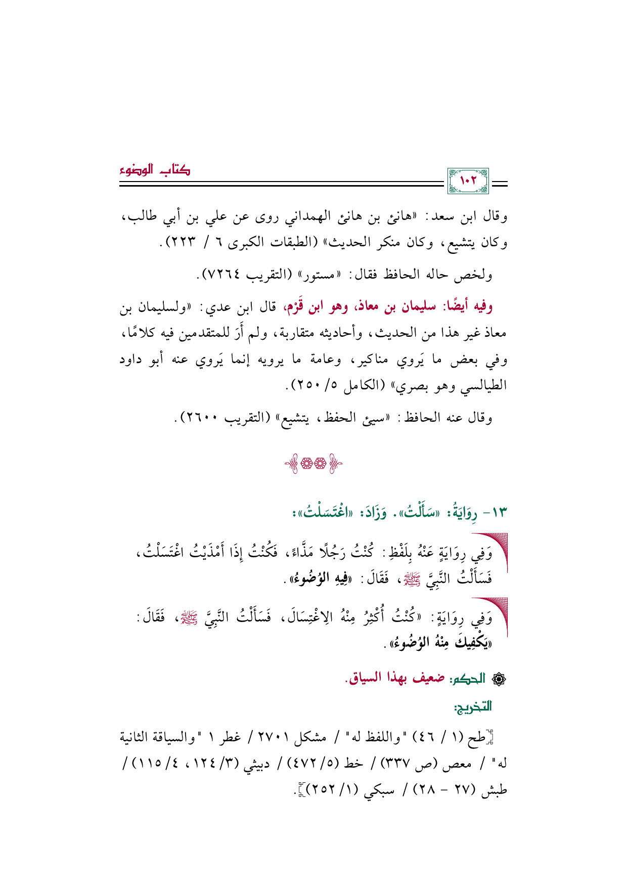 وقال ابن سعد: "هانئ بن هانئ الهمداني روى عن علي بن أبي طالب، وكان يتشيع، وكان منكر الحديث" (الطبقات الكبرى ٦/ ٢٢٣).