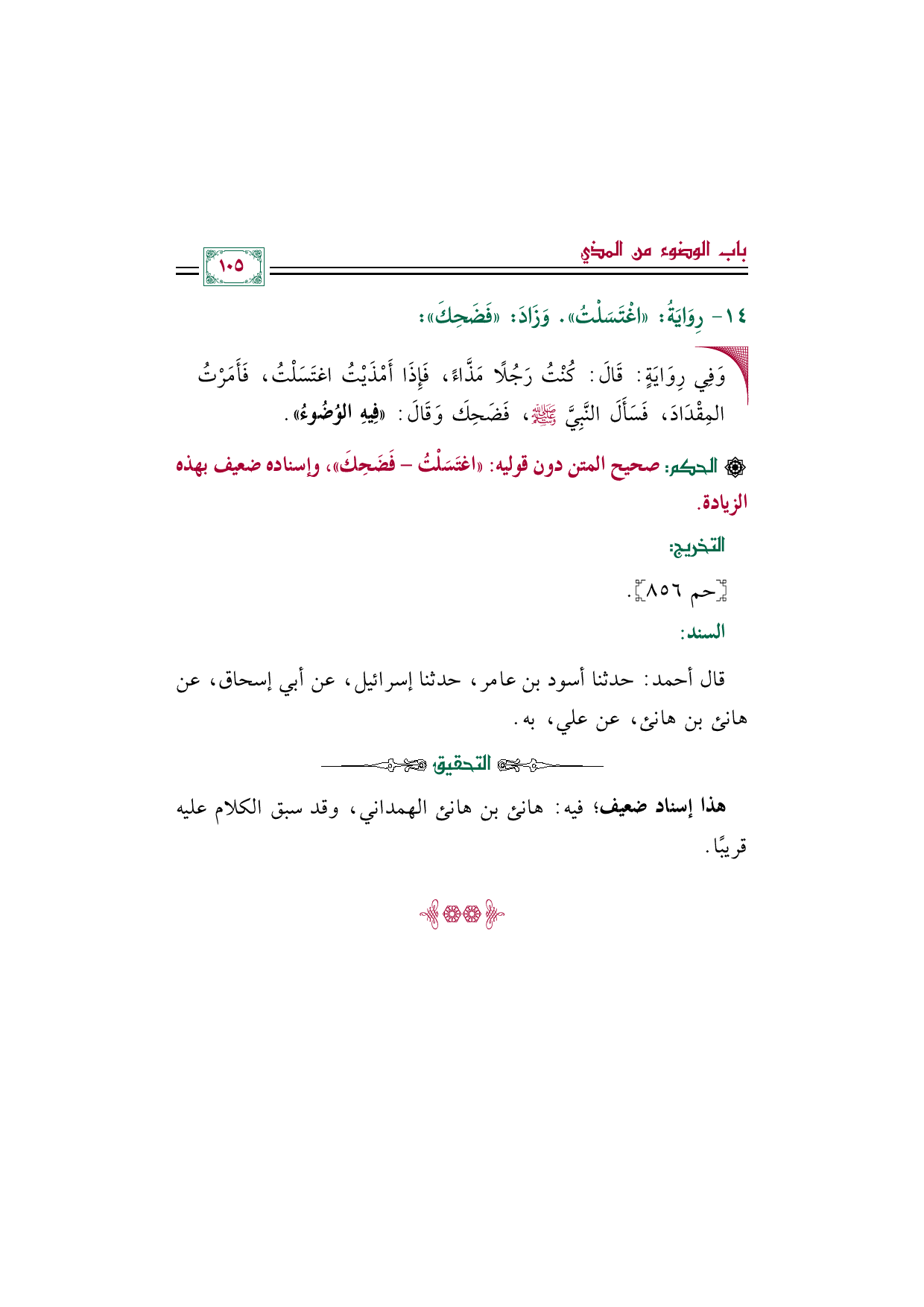 • وَفِي رِوَايَةٍ: قَالَ: كُنْتُ رَجُلًا مَذَّاءً، فَإِذَا أَمْذَيْتُ اغتَسَلْتُ، فَأَمَرْتُ المِقْدَادَ، فَسَأَلَ النَّبِيَّ صَلَّى اللهُ عَلَيْهِ وَسَلَّمَ، فَضَحِكَ وَقَالَ: «فِيهِ الوُضُوءُ».