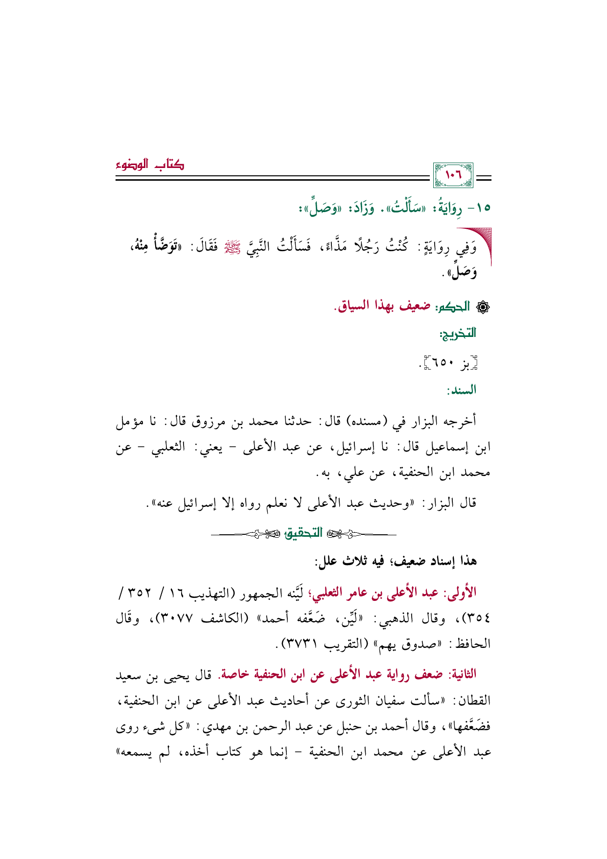 الثانية: ضعف رواية عبد الأعلى عن ابن الحنفية خاصة. قال يحيى بن سعيد القطان: " سألت سفيان الثورى عن أحاديث عبد الأعلى عن ابن الحنفية، فضَعَّفها"، وقال أحمد بن حنبل عن عبد الرحمن بن مهدي: " كل شئ روى عبد الأعلى عن محمد ابن الحنفية- إنما هو كتاب أخذه، لم يسمعه"