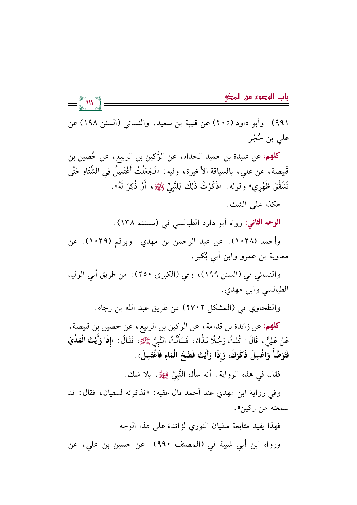 كلهم: عن عبيدة بن حميد الحذاء، عن الرُّكين بن الربيع، عن حُصين بن قَبيصة، عن علي، بالسياقة الأخيرة، وفيه: ((فَجَعَلْتُ أَغْتَسِلُ فِي الشِّتَاءِ حَتَّى تَشَقَّقَ ظَهْرِي)) وقوله: ((ذَكَرْتُ ذَلِكَ لِلنَّبِيِّ صَلَّى اللهُ عَلَيْهِ وَسَلَّمَ، أَوْ ذُكِرَ لَهُ)).