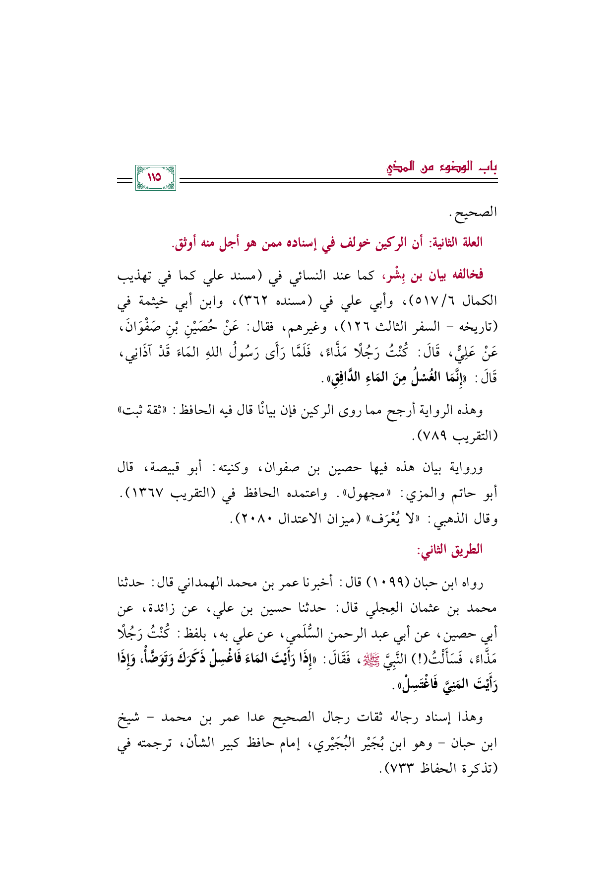 فخالفه بيان بن بِشْر، كما عند النسائي في (مسند علي كما في تهذيب الكمال ٦/ ٥١٧)، وأبي علي في (مسنده ٣٦٢)، وابن أبي خيثمة في (تاريخه-السفر الثالث ١٢٦)، وغيرهم، فقال: عَنْ حُصَيْنِ بْنِ صَفْوَانَ، عَنْ عَلِيٍّ، قَالَ: كُنْتُ رَجُلًا مَذَّاءً، فَلَمَّا رَأَى رَسُولُ اللهِ المَاءَ قَدْ آذَانِي، قَالَ: ((إِنَّمَا الغُسْلُ مِنَ المَاءِ الدَّافِقِ)).